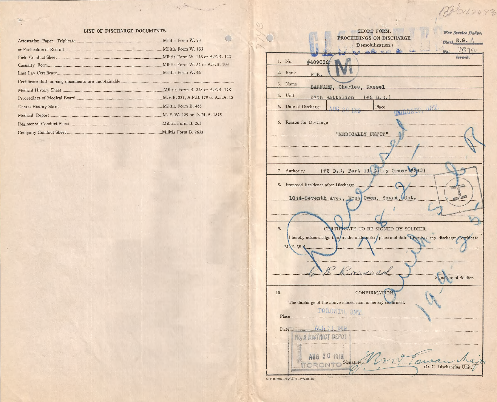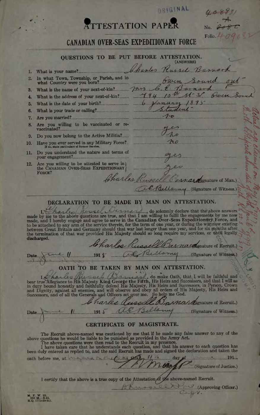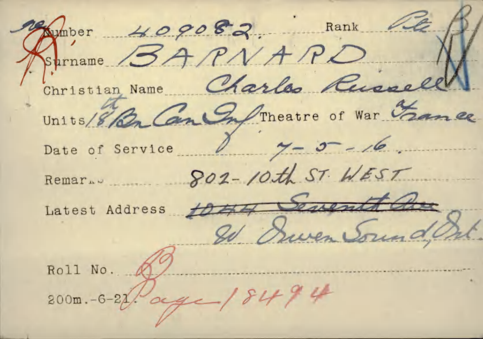 Private Charles Russell Barnard. Regimental Number 409082.