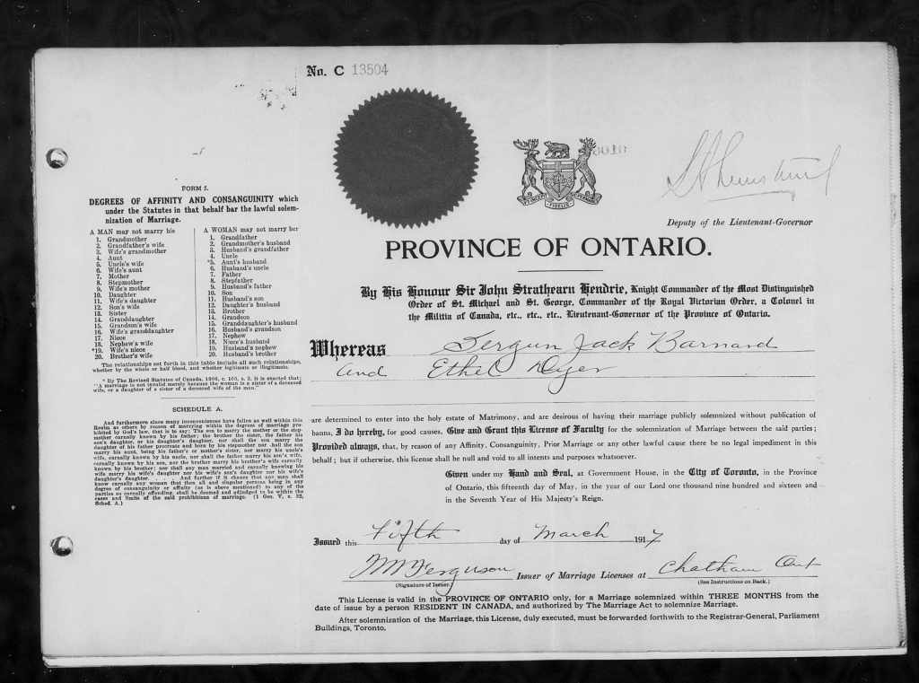 Family Search: Private Sergun Jack Barnard was born on 31 March 1893, in Gosfield, Essex, England, United Kingdom as the son of John Barnard and Elizabeth French. He married Ethel Dyer on 5 March 1917, in Chatham, Kent, Ontario, Canada. He immigrated to Canada in 1913 and lived in Chatham, Kent, Ontario, Canada in 1917 and London, Ontario, Canada in 1922. He registered for military service in 1915. In 1915, at the age of 22, his occupation is listed as farmer. He died in 1974, at the age of 81.