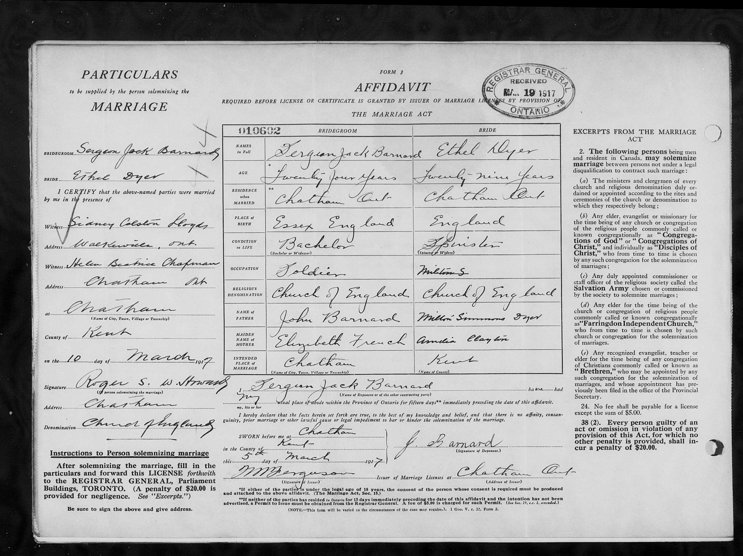 Family Search: Private Sergun Jack Barnard was born on 31 March 1893, in Gosfield, Essex, England, United Kingdom as the son of John Barnard and Elizabeth French. He married Ethel Dyer on 5 March 1917, in Chatham, Kent, Ontario, Canada. He immigrated to Canada in 1913 and lived in Chatham, Kent, Ontario, Canada in 1917 and London, Ontario, Canada in 1922. He registered for military service in 1915. In 1915, at the age of 22, his occupation is listed as farmer. He died in 1974, at the age of 81.