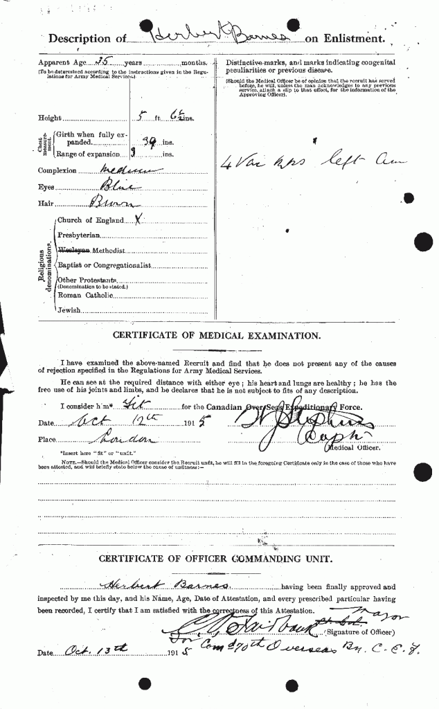 The man enlisted in the 70th Battalion CEF in London, Ontario on October 12, 1914. He was married to Mrs. Martha Barnes, residing at 603 Oxford Street, London, Ontario. He was a butcher by trade.