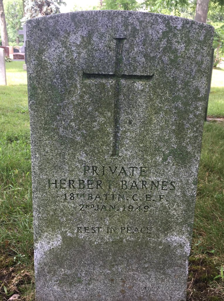 Family Search: Private Herbert Barnes was born on 18 March 1878, in Witney, Oxfordshire, England, United Kingdom. He had at least 1 son with Martha Leigh. He immigrated to Canada in 1913. He registered for military service in 1915. In 1915, at the age of 37, his occupation is listed as butcher. He died on 2 January 1949, in London, Ontario, Canada, at the age of 70, and was buried in Mount Pleasant Cemetery, West McGillivray, North Middlesex, Middlesex, Ontario, Canada.