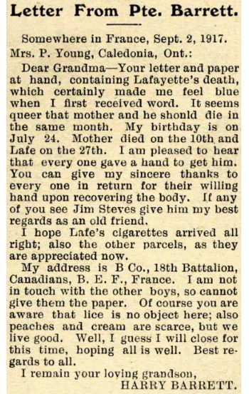 [iii] Lafayette Barrett was born March 1906. Private Barrett also had 2 sisters. The census tables do not record his mother. 1911 Census. Ontario, Haldimand, Caledonia. District 41. Page 3.