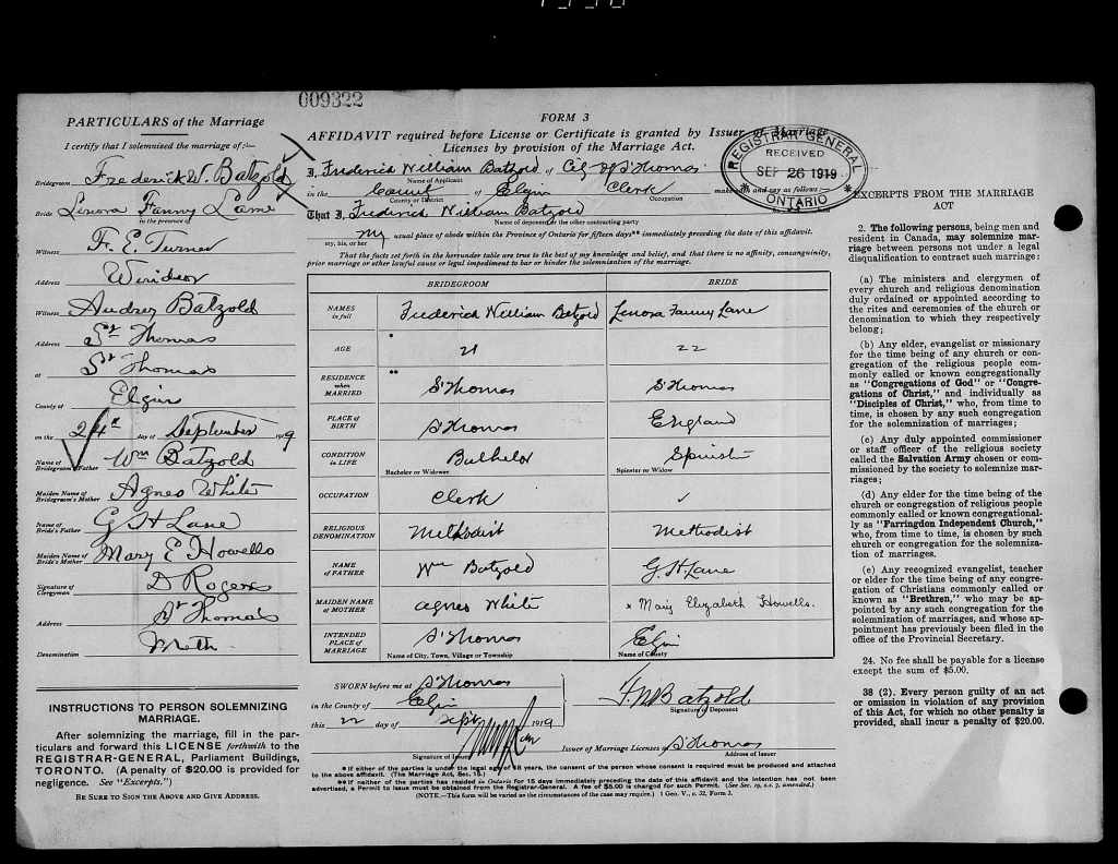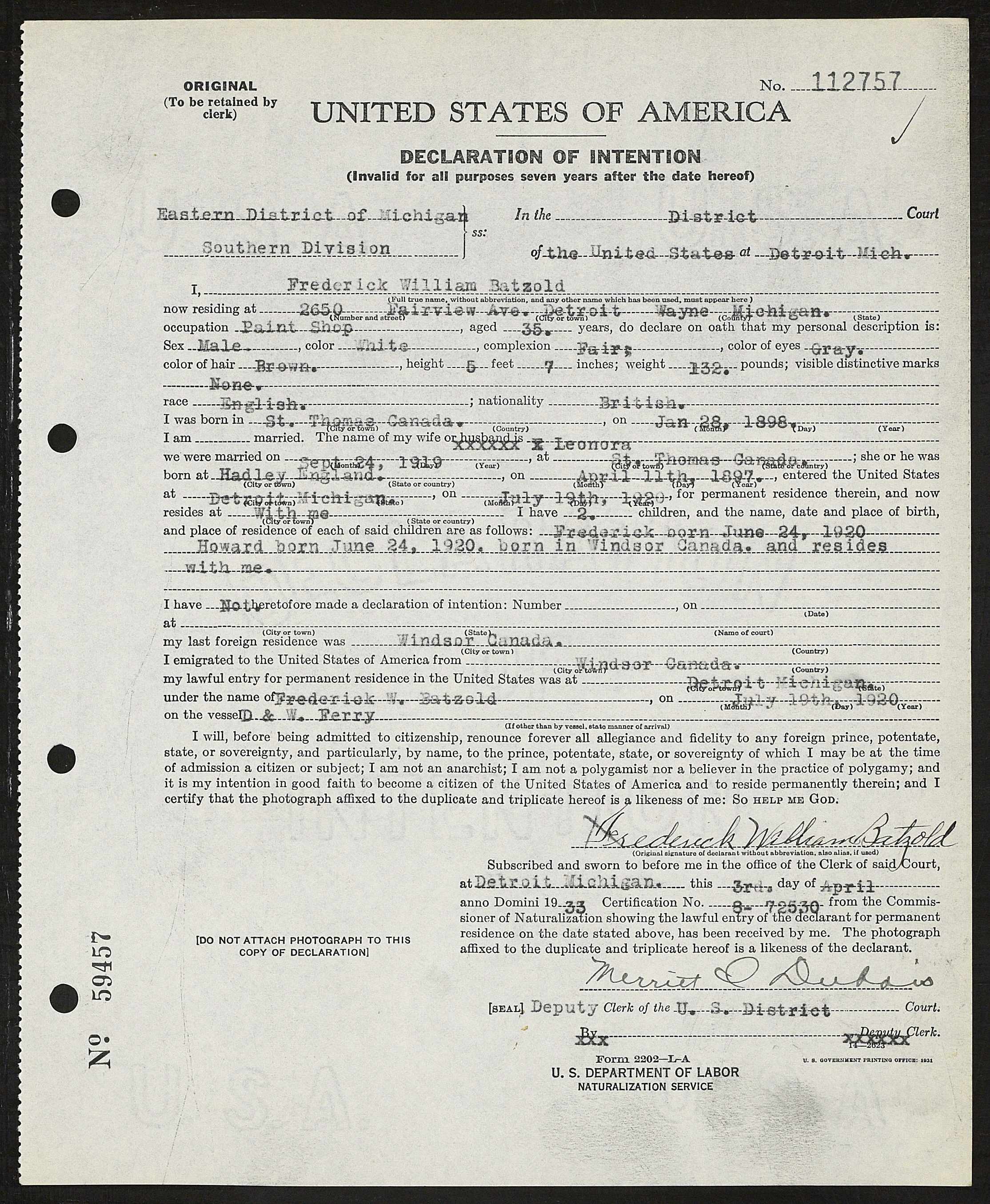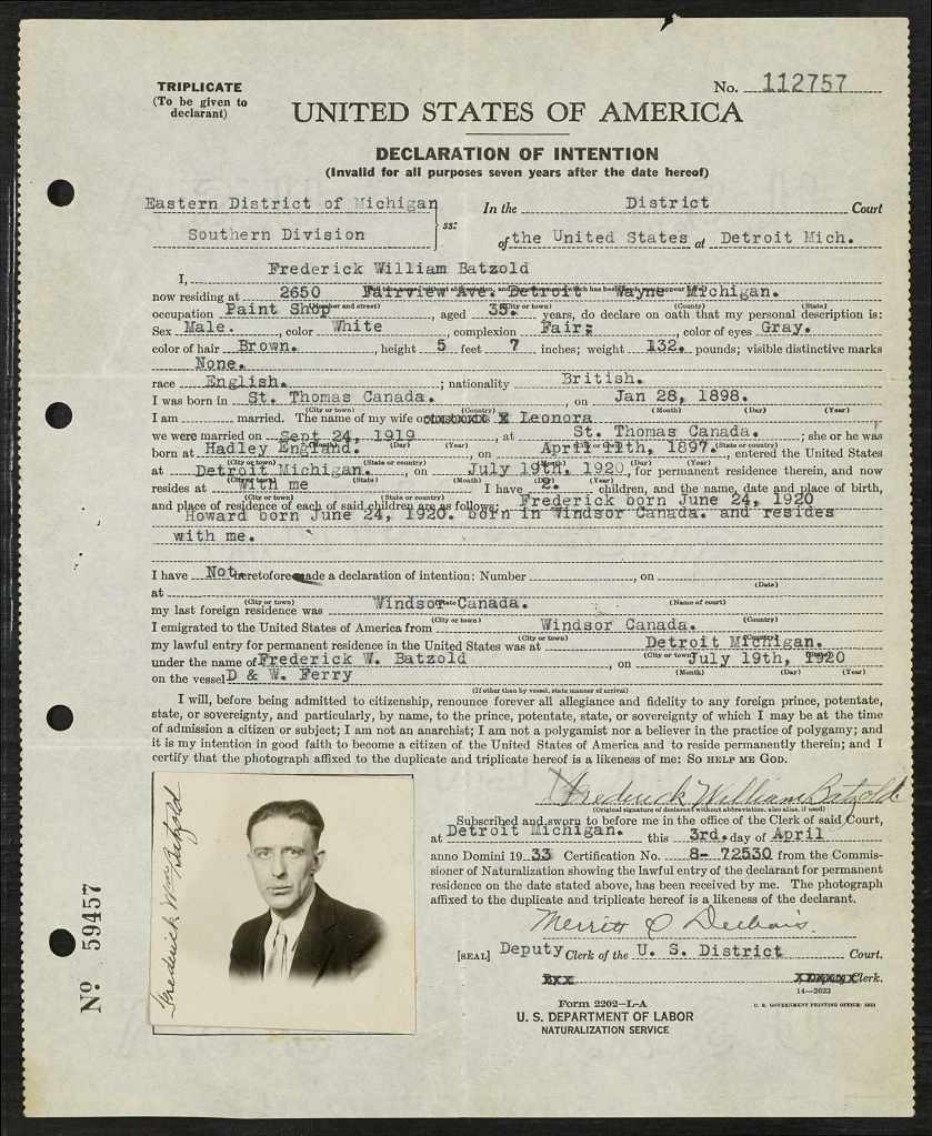 Family Search: When Private Frederick William Batzold was born on 28 January 1898, in St. Thomas, Ontario, Canada, his father, William Batzold, was 30 and his mother, Agnes White, was 21. He married Lenora Fanny Lane on 24 September 1919, in St. Thomas, Ontario, Canada. They were the parents of at least 2 sons. He immigrated to Detroit, Wayne, Michigan, United States in 1920 and lived in Detroit Ward 21, Detroit, Wayne, Michigan, United States in 1940 and Royal Oak, Royal Oak, Oakland, Michigan, United States in 1950. He registered for military service in 1916. In 1942, at the age of 44, his occupation is listed as paint shop, ford motor company in Highland Park, Wayne, Michigan, United States. He died in May 1965, in Michigan, United States, at the age of 67.