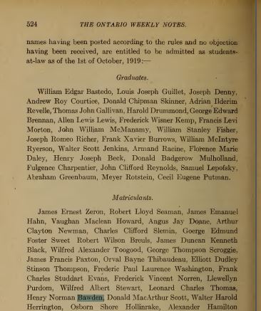Born in 1898, Harry Norman Bawden joined the 18th Canadian Battalion when he was eighteen. He fought and survived the battlefields of France, Germany and Vimy Ridge. After graduating with a Law Degree from Osgoode Hall in Toronto in 1923 he joined Dominion Securities Corporation, one of Canada’s largest investment banks. Schooled in the world of finance, largely during the Great Depression he eventually became the firm’s President and Chief Executive Officer. Throughout his career Harry Bawden held many prominent positions such as: Director of the War Finance Committee and was an active Board member of Molson’s Brewery Ltd, Dominion Foundries & Steel (2nd largest and most profitable steel company), Toronto Western Hospital, Maple Leaf Milling (large food conglomerate), and others. He maintained an active interest in the corporate and political affairs of the nation until he died in 1976. Source: http://www.bawdencapital.com/bawdens.htm