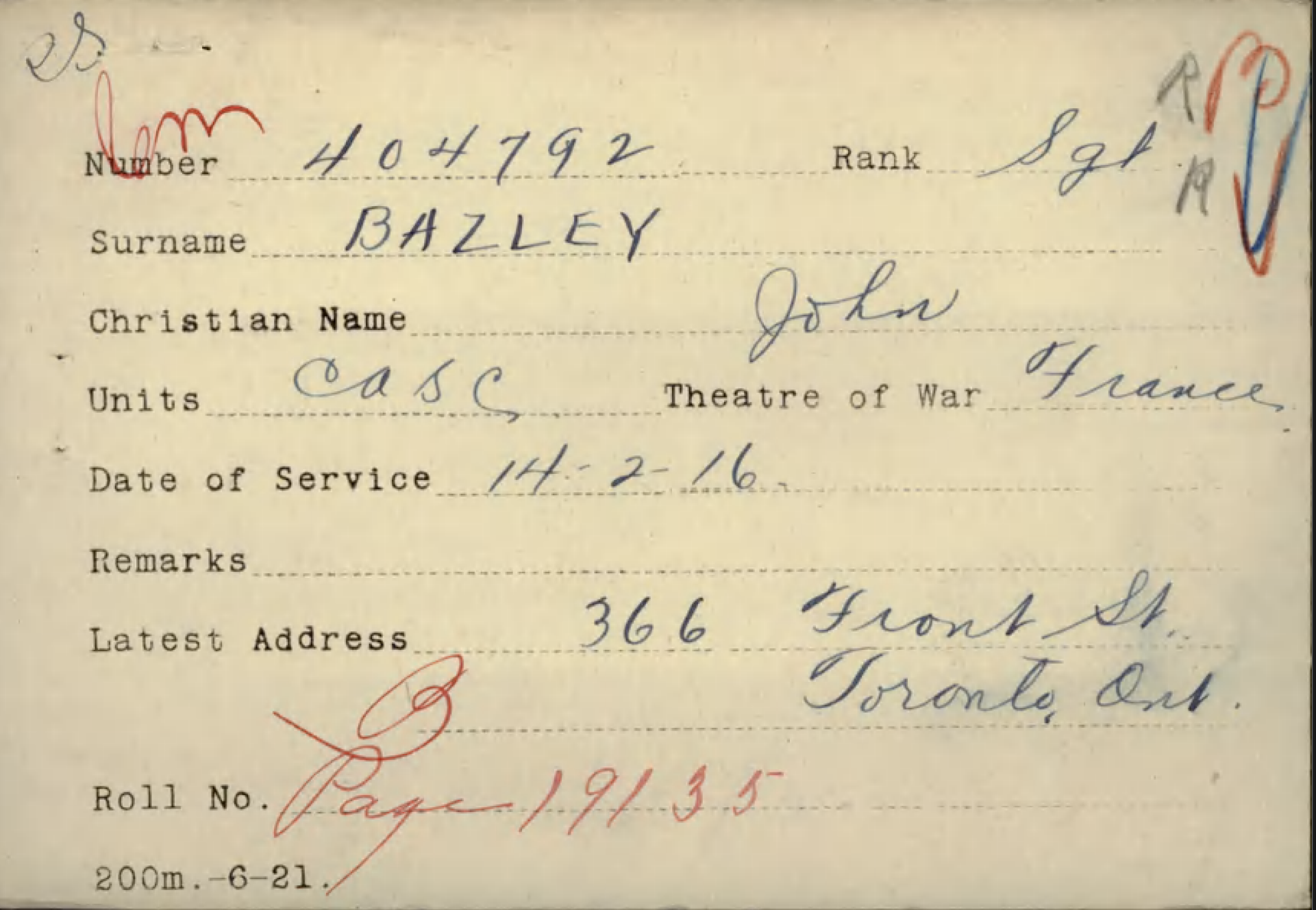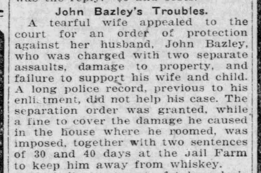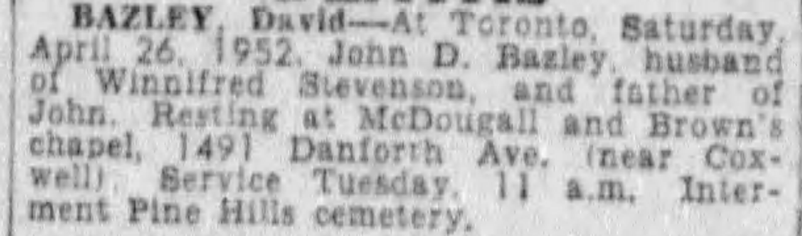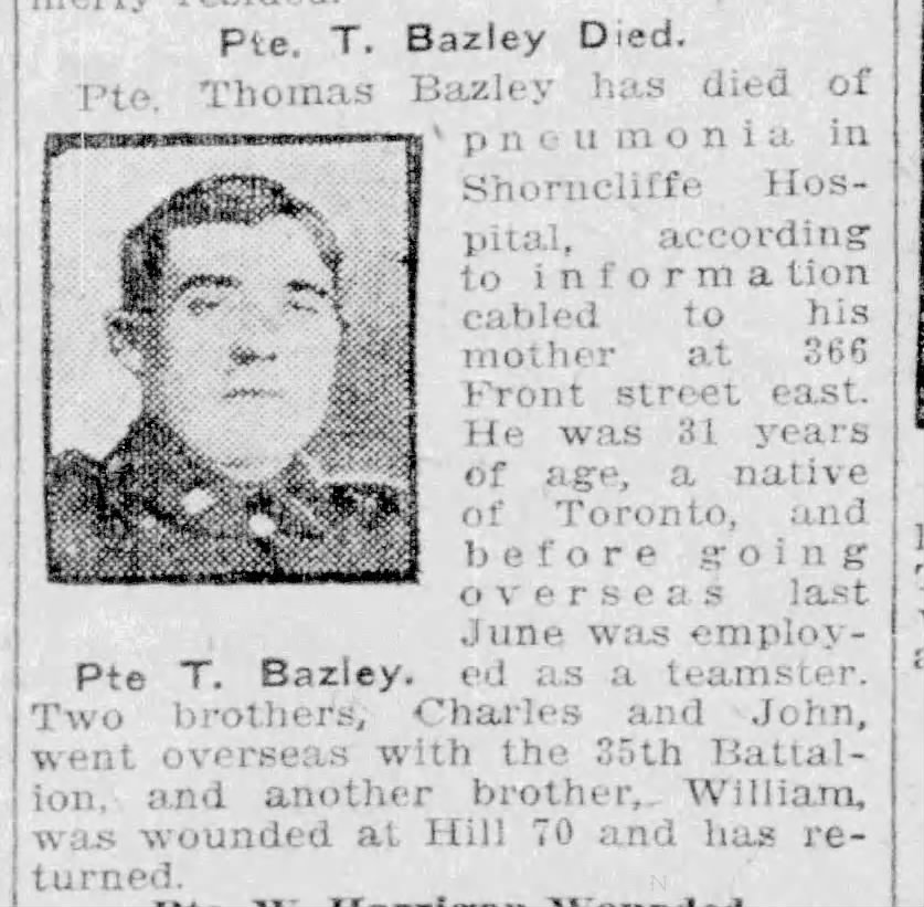 Family Search: When Corporal John David Bazley was born on 15 May 1892, in Toronto, York, Ontario, Canada, his father, Thomas Bazley, was 39 and his mother, Mary Collier, was 34. He married Winnifred Stevenson in 1918, in England, United Kingdom. They were the parents of at least 1 son. He registered for military service in 1915. In 1931, at the age of 39, his occupation is listed as teamster in Toronto, York, Ontario, Canada. He died on 26 April 1952, in Toronto, York, Ontario, Canada, at the age of 59, and was buried in Pine Hills Cemetery, Scarborough, Toronto, Ontario, Canada.