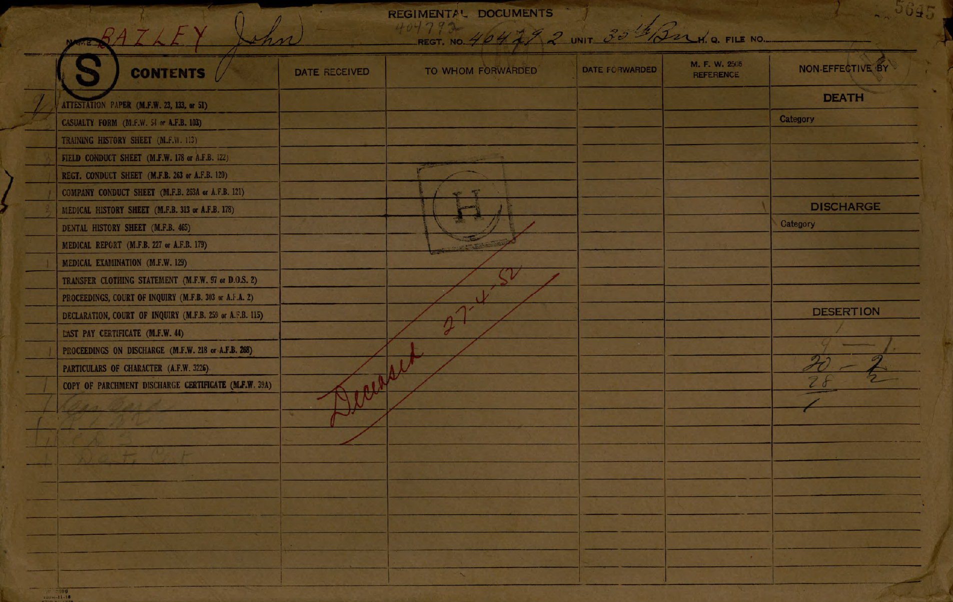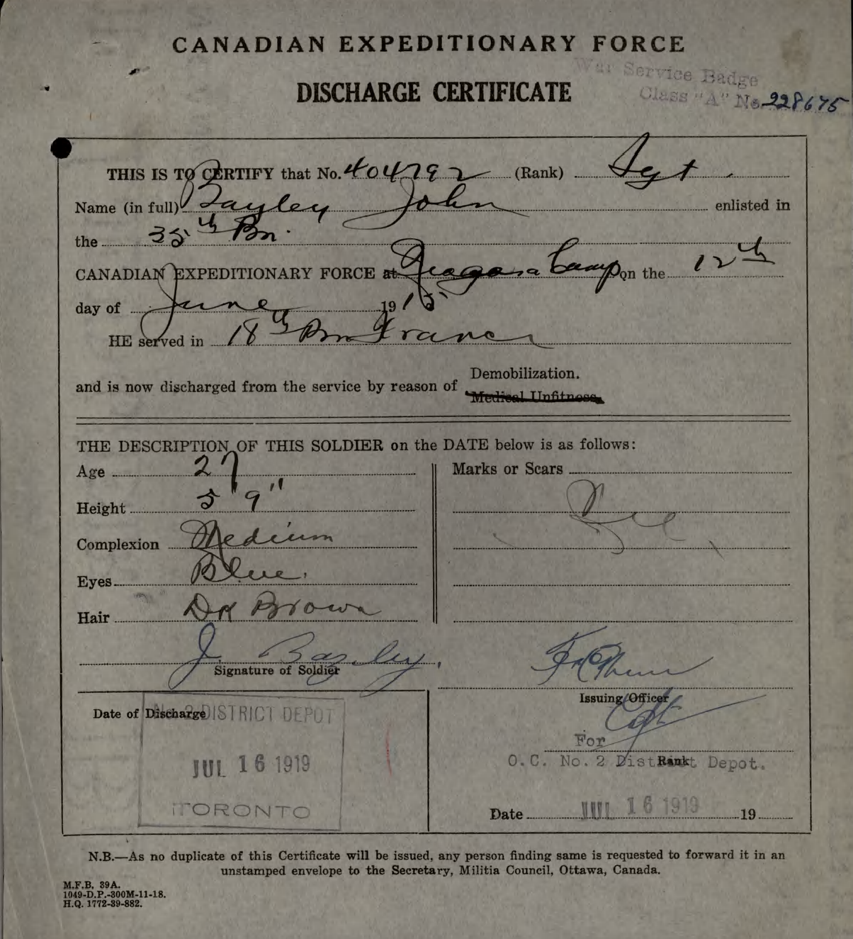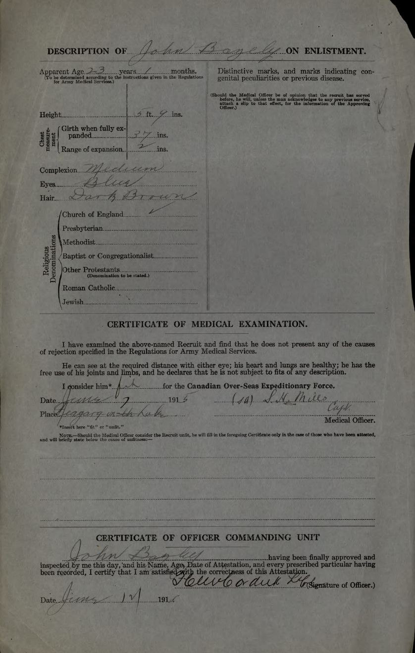 Family Search: When Corporal John David Bazley was born on 15 May 1892, in Toronto, York, Ontario, Canada, his father, Thomas Bazley, was 39 and his mother, Mary Collier, was 34. He married Winnifred Stevenson in 1918, in England, United Kingdom. They were the parents of at least 1 son. He registered for military service in 1915. In 1931, at the age of 39, his occupation is listed as teamster in Toronto, York, Ontario, Canada. He died on 26 April 1952, in Toronto, York, Ontario, Canada, at the age of 59, and was buried in Pine Hills Cemetery, Scarborough, Toronto, Ontario, Canada.