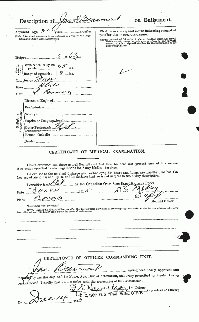 Beaumont, James Irvine: Service no. 775231. Source: Toronto Telegram. August 1917. Per news clipping post by David Archer at 18th Battalion Facebook Page (not group).