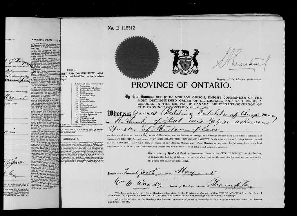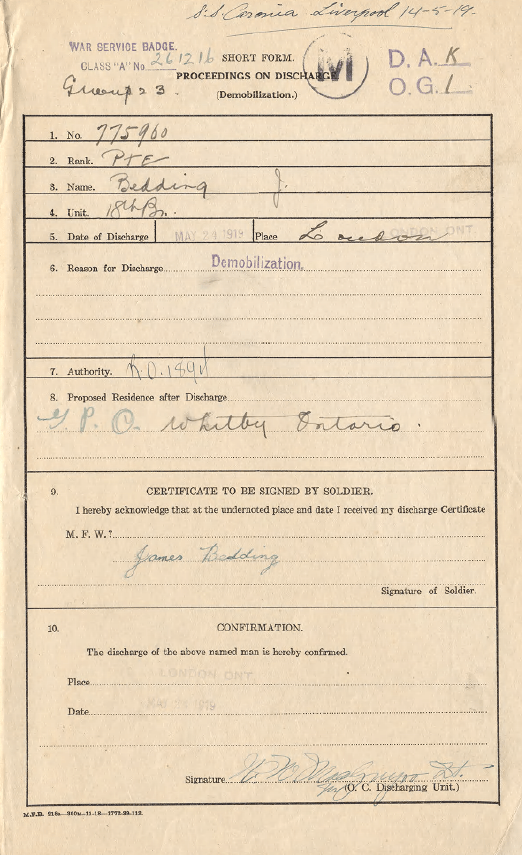 Family Search: When Private James Bedding was born on 12 December 1893, in Oxford, Oxfordshire, England, United Kingdom, his father, Jesse Bedden, was 34 and his mother, Eliza Unknown, was 32. He married Gertrude Ackinson on 26 May 1915, in Brampton, Peel, Ontario, Canada. They were the parents of at least 1 son. He immigrated to Canada in 1913 and lived in Cowley, Oxfordshire, England, United Kingdom in 1901 and Malton, Toronto Township, Peel, Ontario, Canada in 1916. He registered for military service in 1916. In 1916, at the age of 23, his occupation is listed as farmer in Malton, Toronto Township, Peel, Ontario, Canada. He died in 1968, at the age of 75, and was buried in Whitby, Durham, Ontario, Canada.