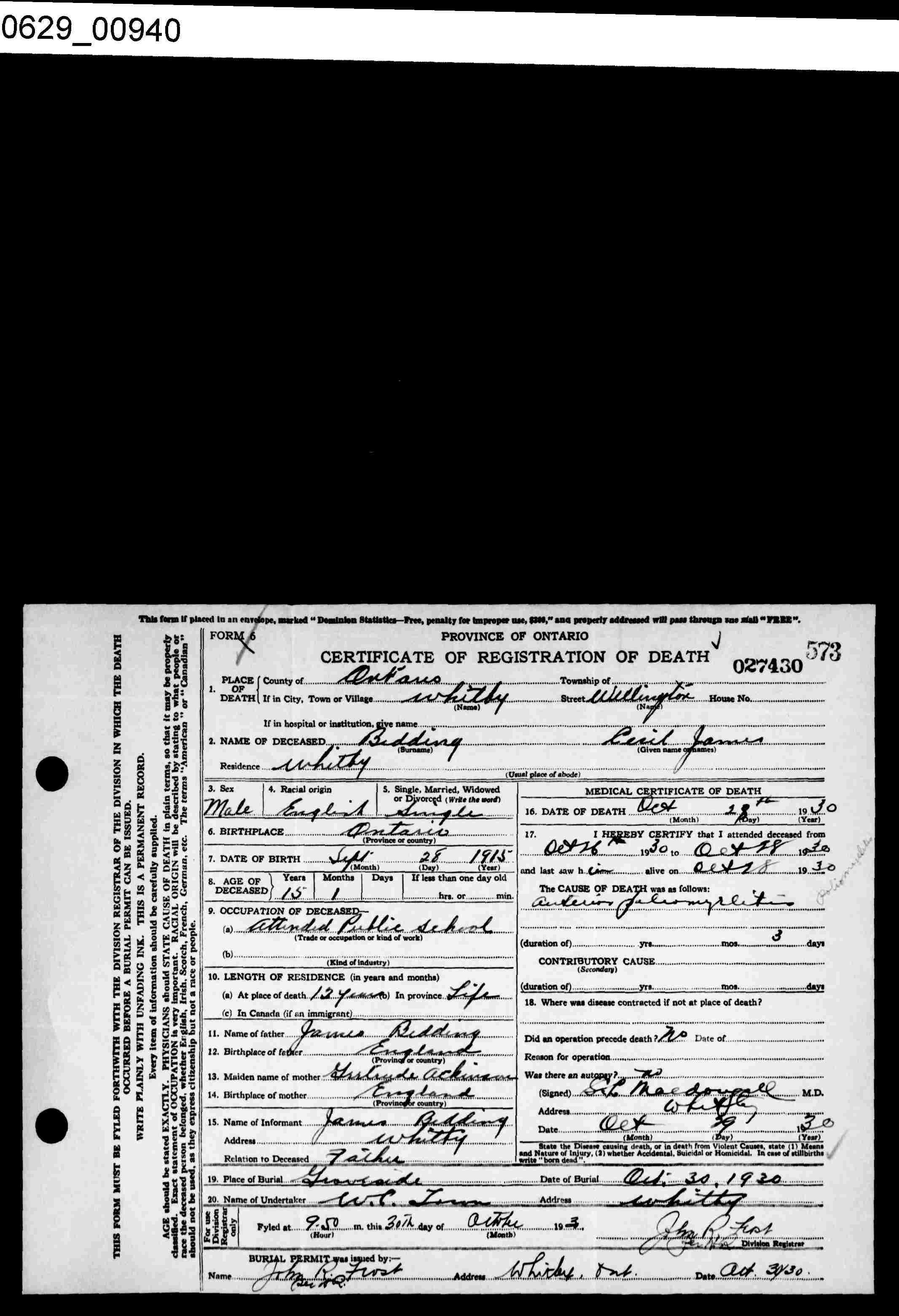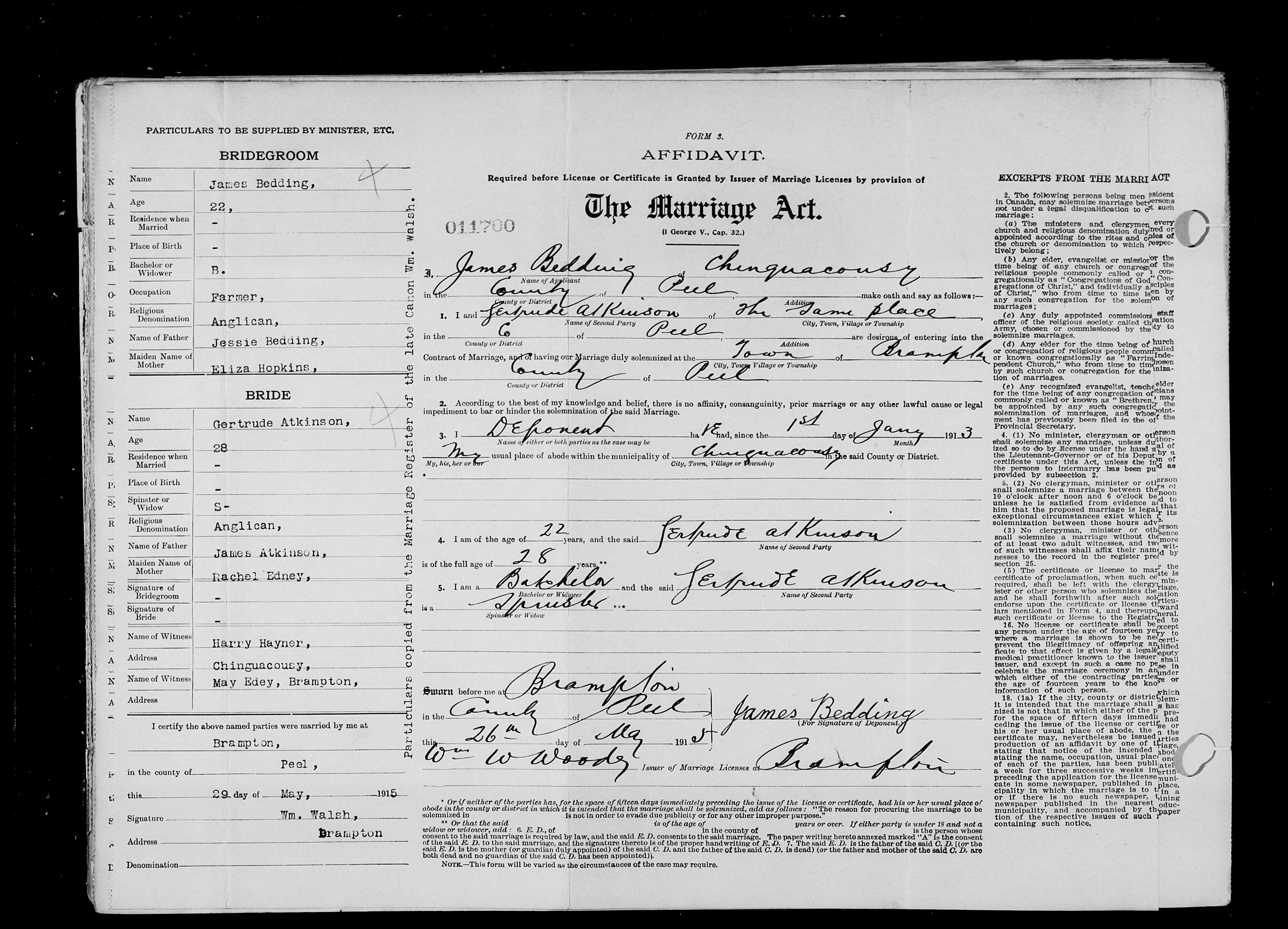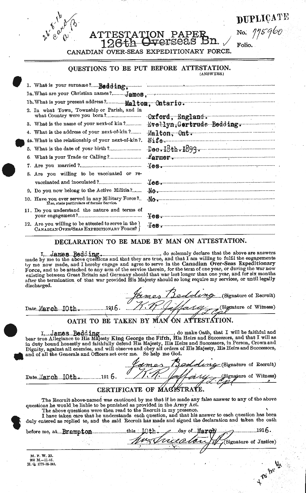 Family Search: When Private James Bedding was born on 12 December 1893, in Oxford, Oxfordshire, England, United Kingdom, his father, Jesse Bedden, was 34 and his mother, Eliza Unknown, was 32. He married Gertrude Ackinson on 26 May 1915, in Brampton, Peel, Ontario, Canada. They were the parents of at least 1 son. He immigrated to Canada in 1913 and lived in Cowley, Oxfordshire, England, United Kingdom in 1901 and Malton, Toronto Township, Peel, Ontario, Canada in 1916. He registered for military service in 1916. In 1916, at the age of 23, his occupation is listed as farmer in Malton, Toronto Township, Peel, Ontario, Canada. He died in 1968, at the age of 75, and was buried in Whitby, Durham, Ontario, Canada.