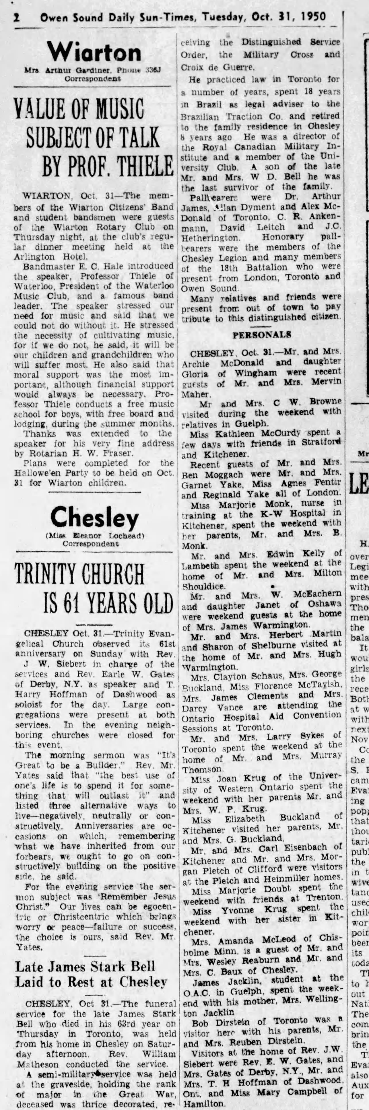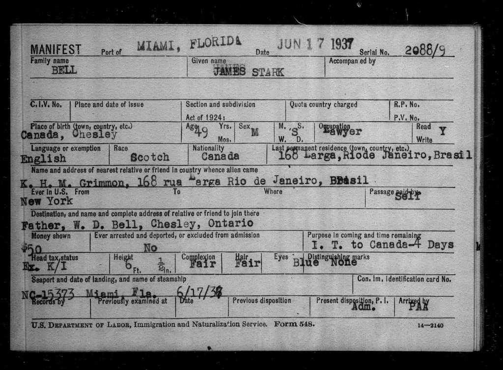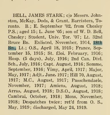 Attended University of Toronto. War Supplement lists him as Bell, James Stark, Lieut.; 18 Bn.: U.C. ’11.