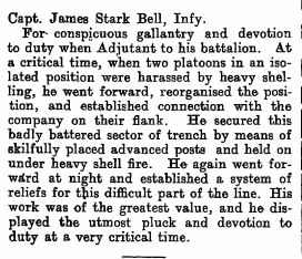 For conspicuous gallantry and devotion to duty when Adjutant to his battalion. At a critical time, when two platoons in an isolated position were harassed by heavy shelling, he went forward, reorganized the position, and established connection with the company on their flank. He secured this badly battered sector of trench by means of skillfully placed advanced posts and held on under heavy shell fire. He again went forward at night and established a system of reliefs for this difficult part of the line. His work was of the greatest value, and he displayed the utmost pluck and devotion to duty at a critical time.
