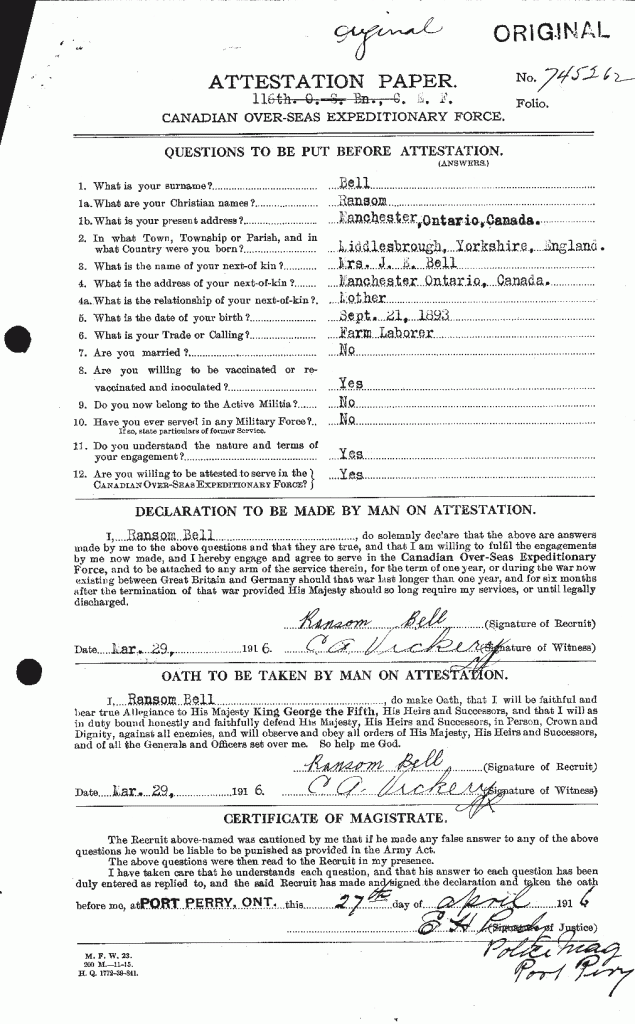 Family Search: When Ransom Bell was born on 21 September 1893, in Yorkshire, England, United Kingdom, his father, Mathew Bell, was 23 and his mother, Jane Elizabeth Barker, was 21. He lived in Middlesbrough, Yorkshire, England, United Kingdom in 1901. He registered for military service in 1916. In 1916, at the age of 23, his occupation is listed as farm labourer in Manchester, Durham, Ontario, Canada. He died on 21 September 1962, at the age of 69, and was buried in Ontario, Canada.