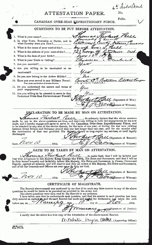 This soldier was temporarily attached to the 18th Battalion December 1917 to January 1918. He was born in Peterborough, Ontario and may have known Lieutenant Eastwood’s father as a child.