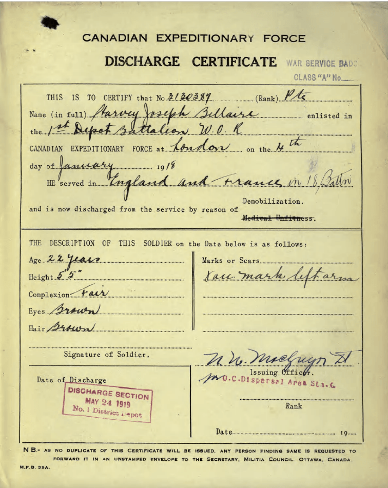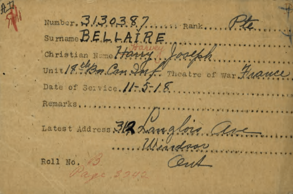 Family Search: When Private Harvey Joseph Bellaire was born on 9 April 1897, in Elmstead, Essex, Ontario, Canada, his father, Stanislas Bellaire, was 25 and his mother, Joséphine Marie Pitre, was 24. He lived in Essex, Ontario, Canada in 1901 and Windsor, Sandwich, Essex, Ontario, Canada for about 13 years. In 1918, at the age of 21, his occupation is listed as machinist in Windsor, Sandwich, Essex, Ontario, Canada. He died on 7 April 1979, in Windsor, Essex, Ontario, Canada, at the age of 81, and was buried in Saint Alphonsus Cemetery, Windsor, Essex, Ontario, Canada.