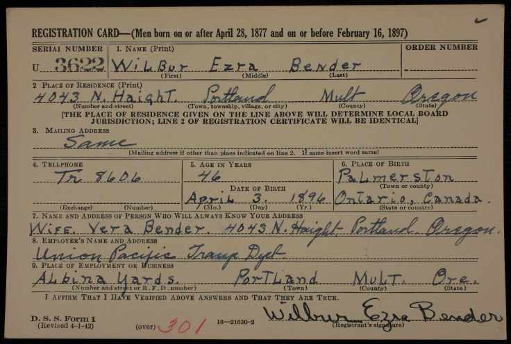 Trade listed as Baker. DOB 3-4-96, born Palmerston. 5 foot 6 1/2 inches. Blue eyes, brown hair. Methodist. NOK Mrs. George Bender, mother. Enlisted Palmerston 12-2-16 (age 19 years). On 153rd Battalion Nominal Roll as published Guelph Mercury 1-12-16. Embarked with 153rd Halifax N.S. SS Olympic 29-4-17. Arrived Liverpool 7-5-17. Assigned 25th Reserve for Training and Administration. Taken on Strength 18th Battalion in the field 8-2-18. Returned to Canada for Discharge aboard SS Caronia, Halifax N.S. 22-5-19. Demobilized 21-5-19, London. Ontario Marriage Registry, married 10-12-24 to Emily Hornsby at Elora. Died 12-5-84. OCFA: buried Elora Municipal Cemetery, Section K,L, M.