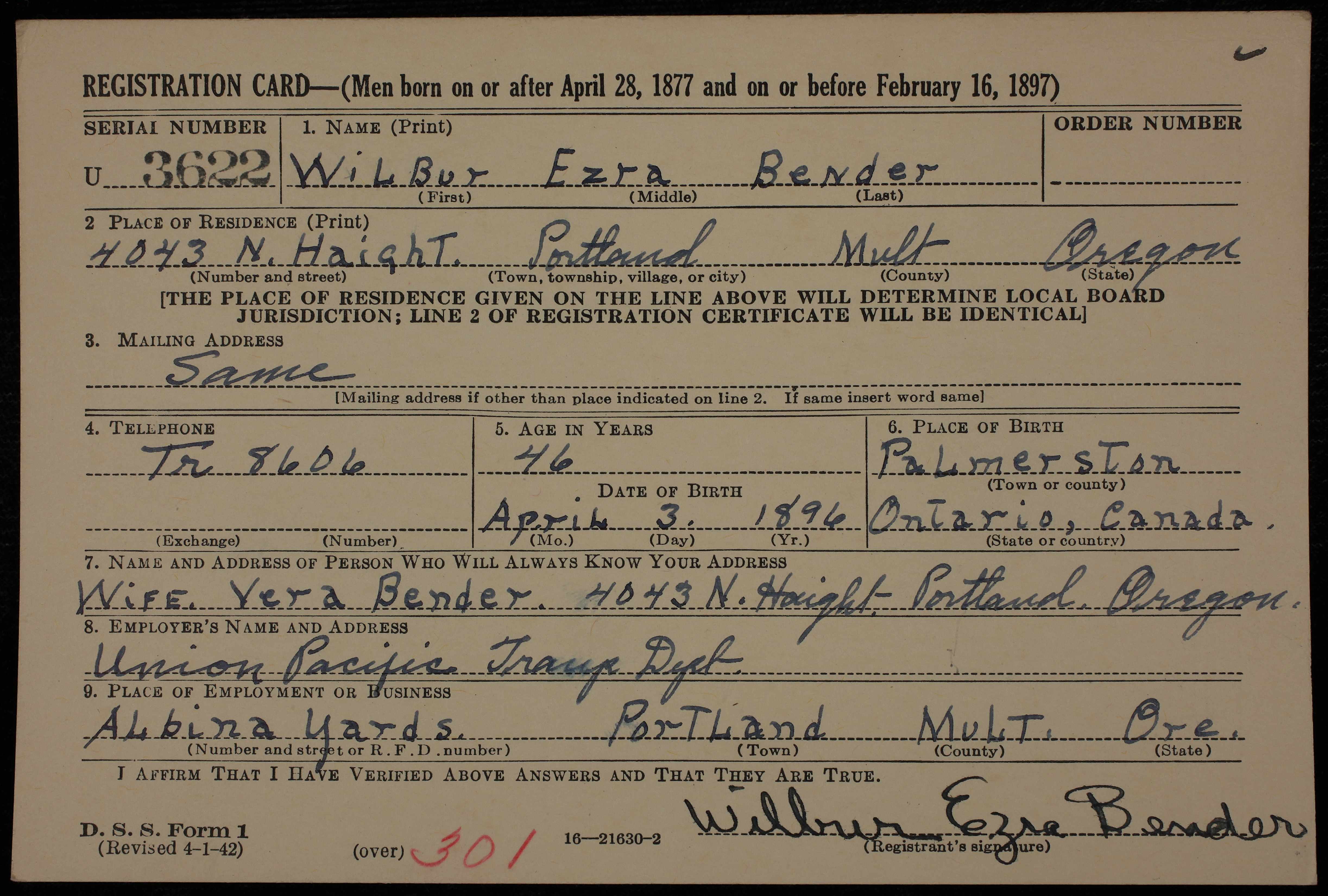 Trade listed as Baker. DOB 3-4-96, born Palmerston. 5 foot 6 1/2 inches. Blue eyes, brown hair. Methodist. NOK Mrs. George Bender, mother. Enlisted Palmerston 12-2-16 (age 19 years). On 153rd Battalion Nominal Roll as published Guelph Mercury 1-12-16. Embarked with 153rd Halifax N.S. SS Olympic 29-4-17. Arrived Liverpool 7-5-17. Assigned 25th Reserve for Training and Administration. Taken on Strength 18th Battalion in the field 8-2-18. Returned to Canada for Discharge aboard SS Caronia, Halifax N.S. 22-5-19. Demobilized 21-5-19, London. Ontario Marriage Registry, married 10-12-24 to Emily Hornsby at Elora. Died 12-5-84. OCFA: buried Elora Municipal Cemetery, Section K,L, M.
