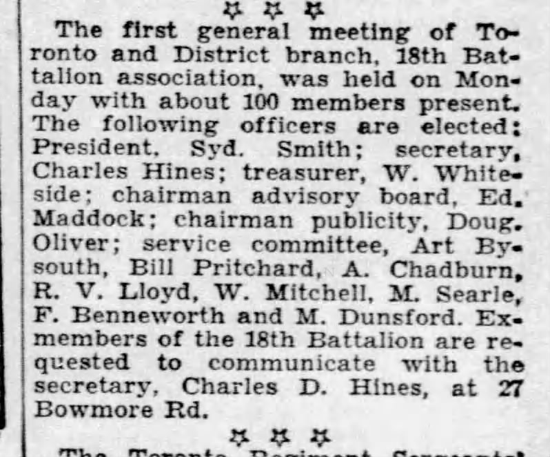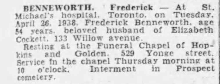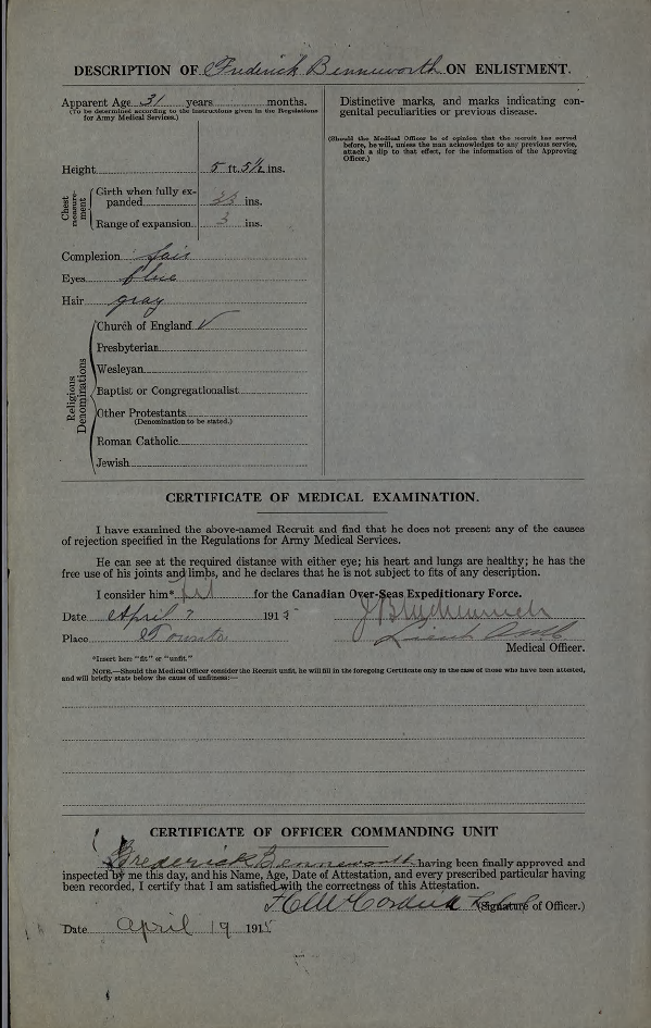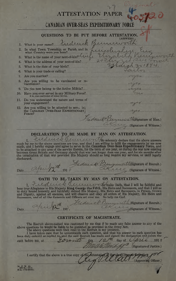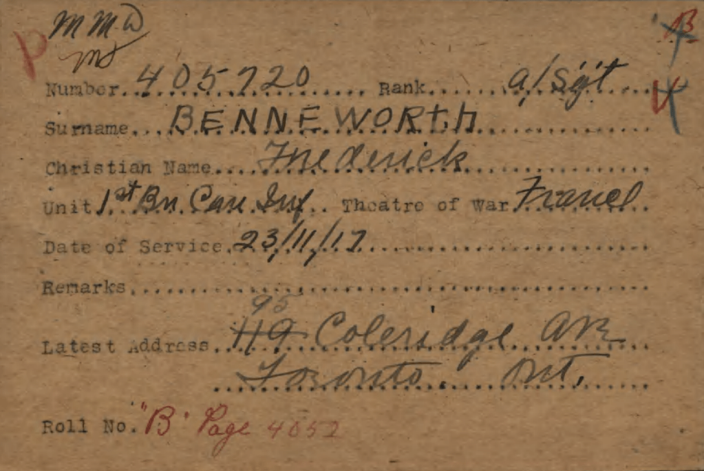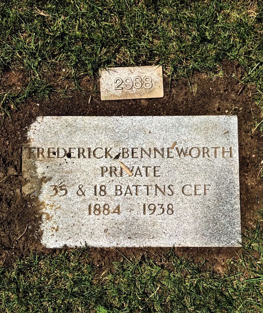 Family Search: Private Frederick Benneworth was born on 30 March 1884, in Lincolnshire, England, United Kingdom as the son of Joseph Benneworth and Betsy Read. He married Elizabeth Maria Cockett on 28 April 1909, in Bardney, Lincolnshire, England, United Kingdom. They were the parents of at least 1 daughter. He lived in Bucknall, Lincolnshire, England, United Kingdom in 1901 and Bardney, Lincolnshire, England, United Kingdom in 1911. In 1901, at the age of 17, his occupation is listed as tailor’s apprentice. He died on 26 April 1938, in Ontario, Canada, at the age of 54, and was buried in Toronto, Ontario, Canada.