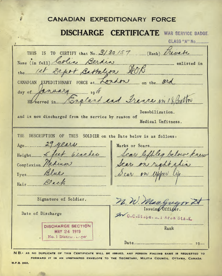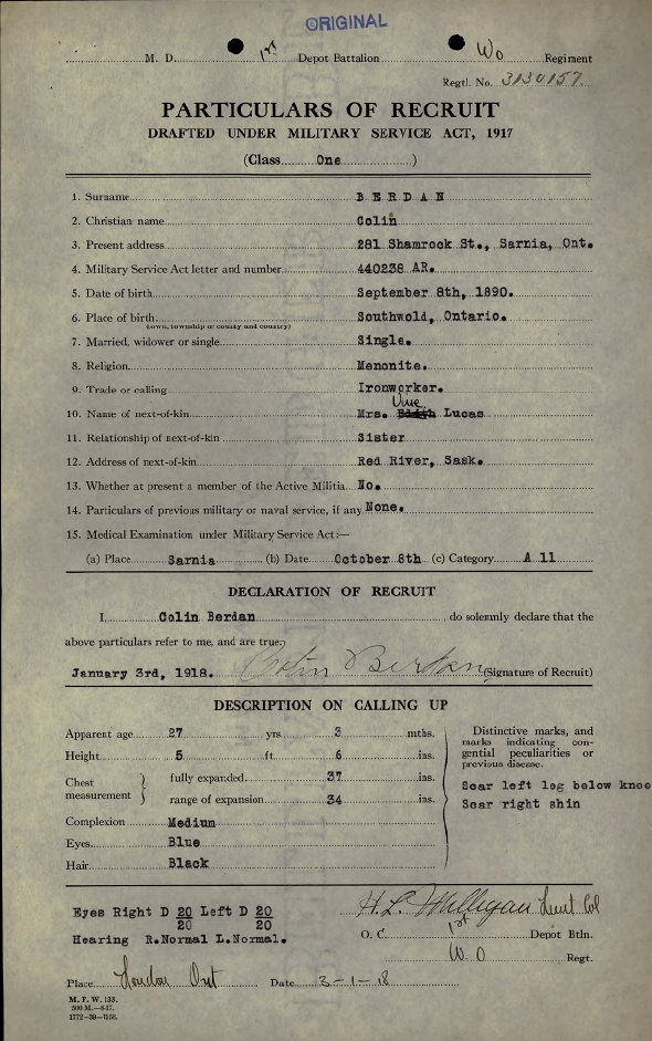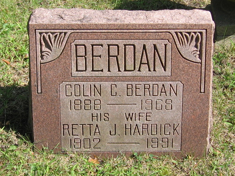Family Search: When Private Colin Campbell Berdan was born on 5 September 1888, in Southwold Township, Elgin, Ontario, Canada, his father, Colin Campbell Berdan, was 31 and his mother, Amelia Jane Dingman, was 32. He married Retta Jane Hardick on 18 June 1921, in Sarnia, Lambton, Ontario, Canada. They were the parents of at least 3 sons and 1 daughter. He lived in Lambton, Ontario, Canada for about 10 years and Sarnia, Sarnia, Lambton, Ontario, Canada in 1931. In 1931, at the age of 43, his occupation is listed as fisherman. He died in 1968, at the age of 80, and was buried in Blackwell United Church Cemetery, Blackwell, Sarnia, Lambton, Ontario, Canada.
