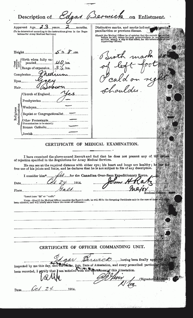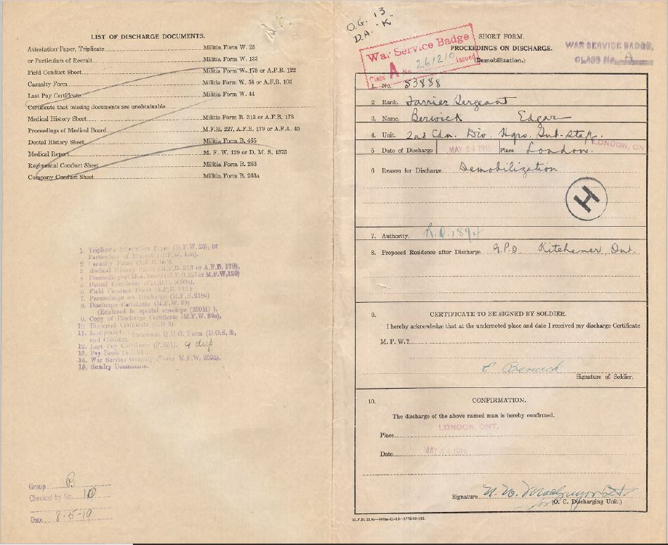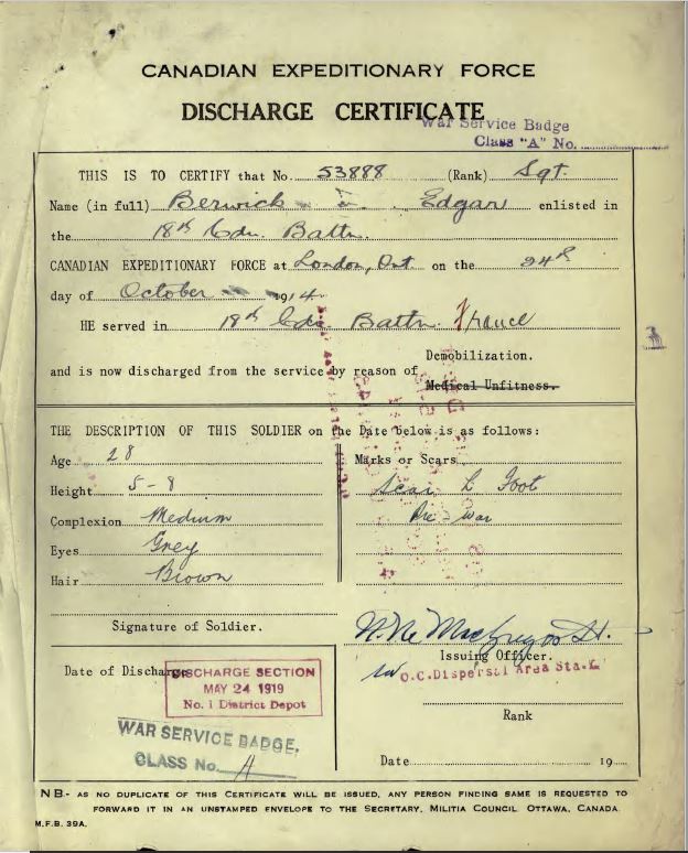 Edgar Berwick of Kitchener, Ontario was very much the Englishman. A product of his times he emigrated to Canada and worked for the Arthur Pequegnat Clock Factory when war was declared. He enlisted in Galt, Ontario as member of the 18th Battalion listing his trade or calling as a mechanic. He served with a spotless record as a Transport Driver with Headquarters Company with the 18th Battalion from the date of enlistment to April 29, 1918 when he was detached to the 2nd Division Headquarters as a farrier. It appears that his skill as a farrier was well appreciated as he was promoted directly from private to farrier sergeant on March 9, 1919. He was reunited with his original battalion on May 4, 1919 and was discharged with this unit upon its return to London, Ontario on May 24, 1919.