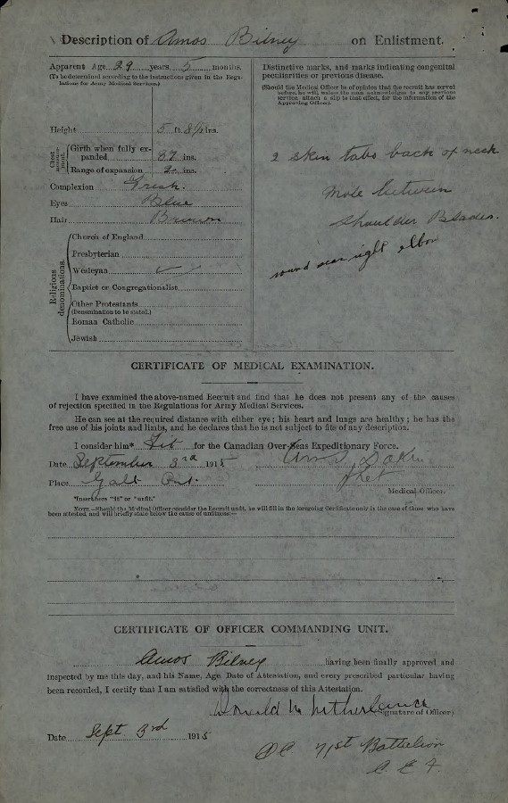 This man was enlisted with the 71st Battalion CEF at Galt, Ontario, on 3 September 1915.