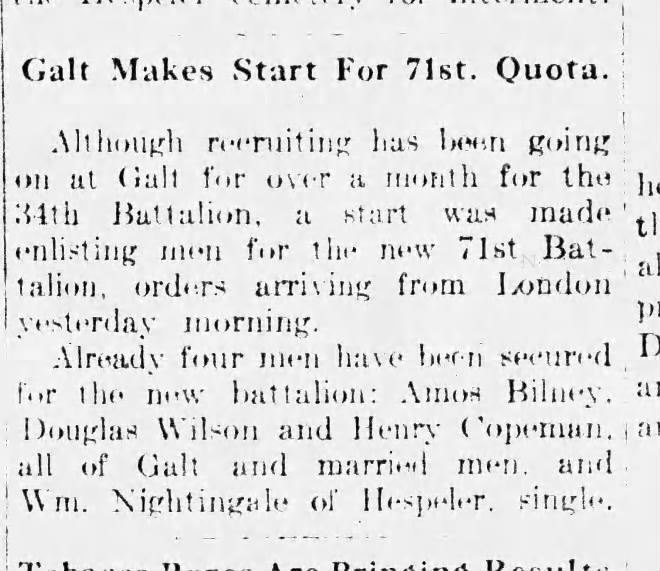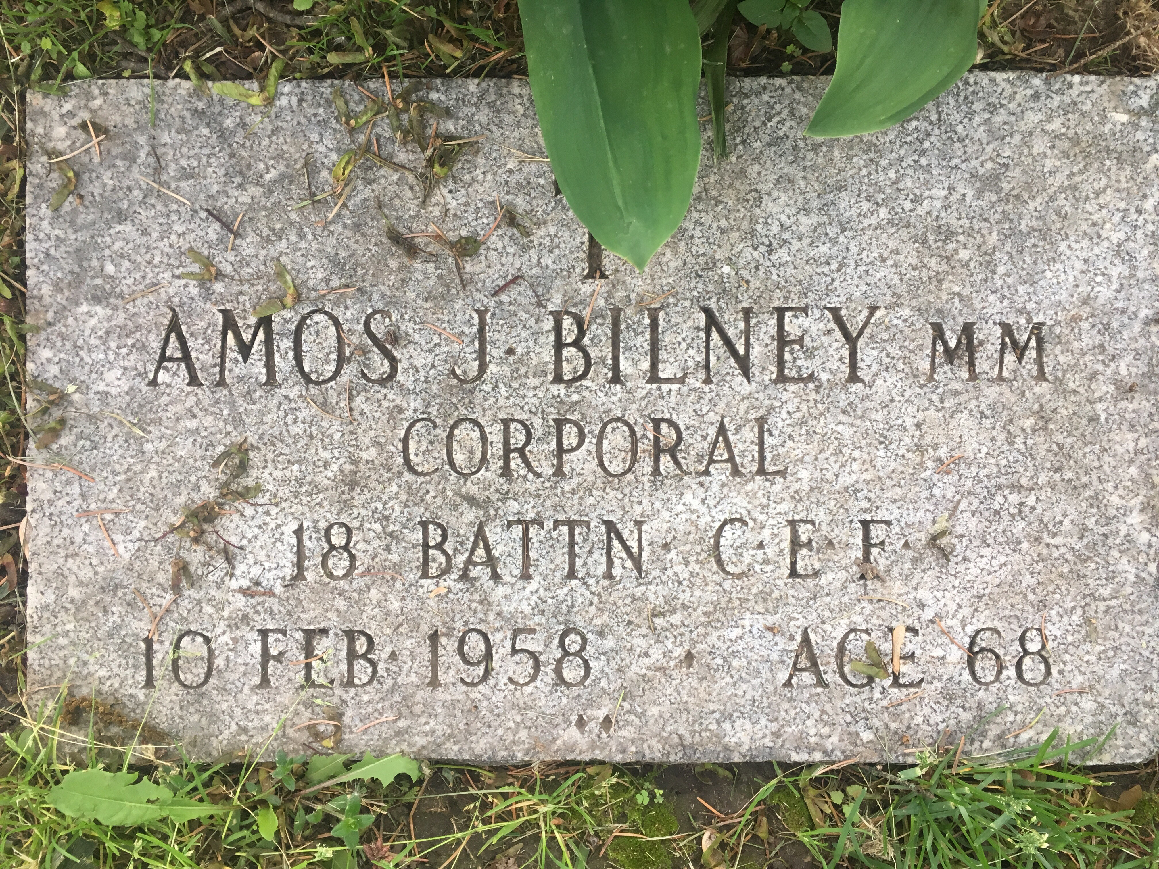 Family Search: When Corporal Amos John Bilney was born on 11 March 1889, in Glasgow, Scotland, United Kingdom, his father, Arthur Bilney, was 25 and his mother, Harriet, was 25. He married Isabella Caroline Naylor on 8 November 1913, in Galt, Waterloo, Ontario, Canada. They were the parents of at least 2 sons and 1 daughter. He lived in Gillingham, Kent, England, United Kingdom in 1901 and Galt, Waterloo, Ontario, Canada for about 17 years. He registered for military service in 1915. His occupation is listed as carpenter in Galt, Waterloo, Ontario, Canada. He died on 10 February 1958, in London, Ontario, Canada, at the age of 68, and was buried in Cambridge, Waterloo, Ontario, Canada.