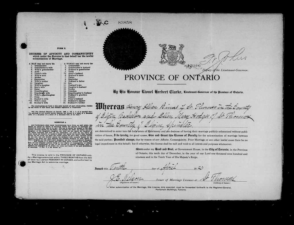 Family Search: When Private Henry Allen Binns was born on 7 February 1891, in St. Thomas, Ontario, Canada, his father, George Binns, was 48 and his mother, Charlotte Ferris, was 30. He married Ellen Mary Hodges on 10 April 1920, in St. Thomas, Ontario, Canada. He lived in Ontario, Canada in 1891 and Elgin, Ontario, Canada for about 10 years. He died in October 1961, at the age of 70, and was buried in Saint Thomas Cemetery, St. Thomas, Ontario, Canada.