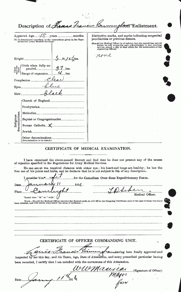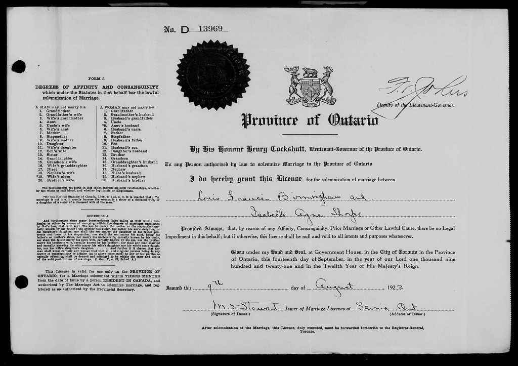 Family Search: When Louis Francis Birmingham was born on 9 March 1899, in Moore, Lambton, Ontario, Canada, his father, David Birmingham, was 46 and his mother, Mary Catherine Degurse, was 38. He married Isabella Agnes Thorpe on 9 August 1922, in Sarnia, Kent, Ontario, Canada. They were the parents of at least 1 son. He lived in Corunna, St. Clair, Lambton, Ontario, Canada in 1916 and Toronto, Ontario, Canada in 1921. He registered for military service in 1916. In 1916, at the age of 17, his occupation is listed as farmer.