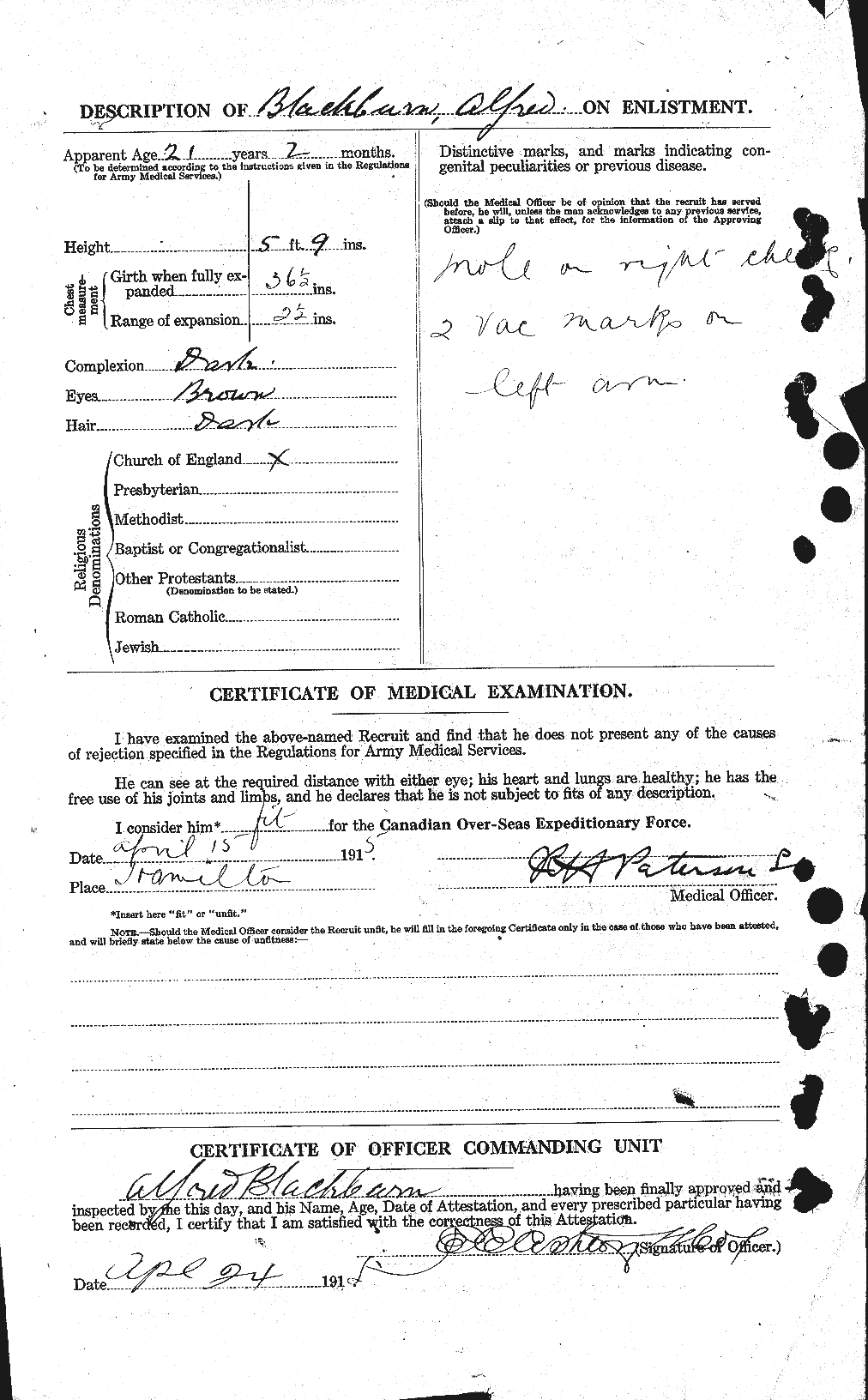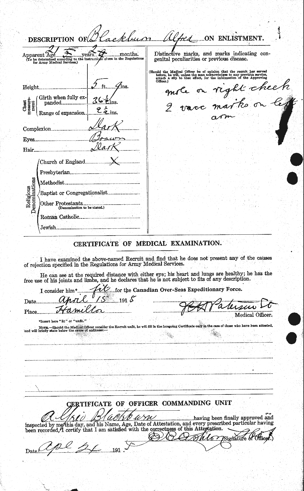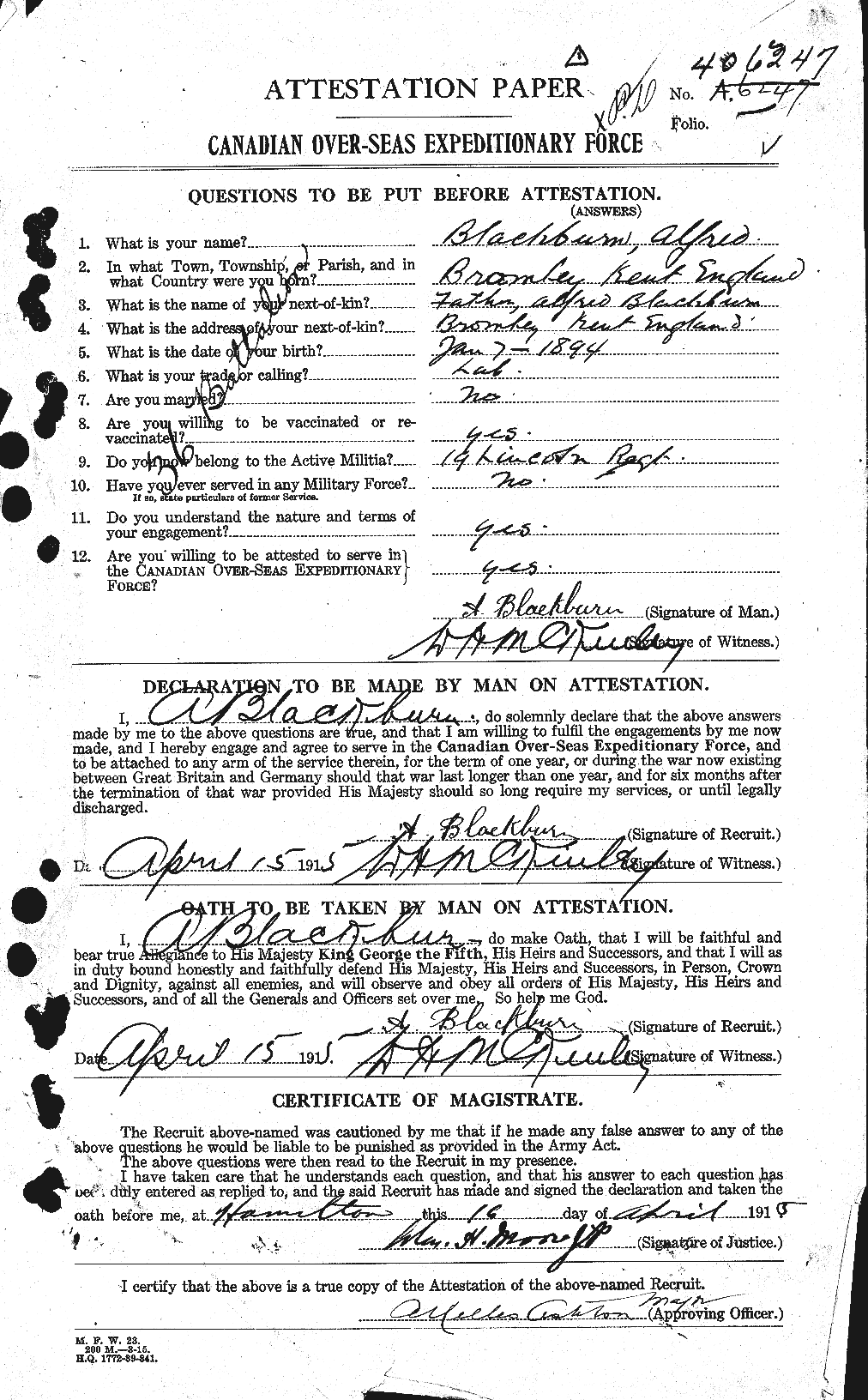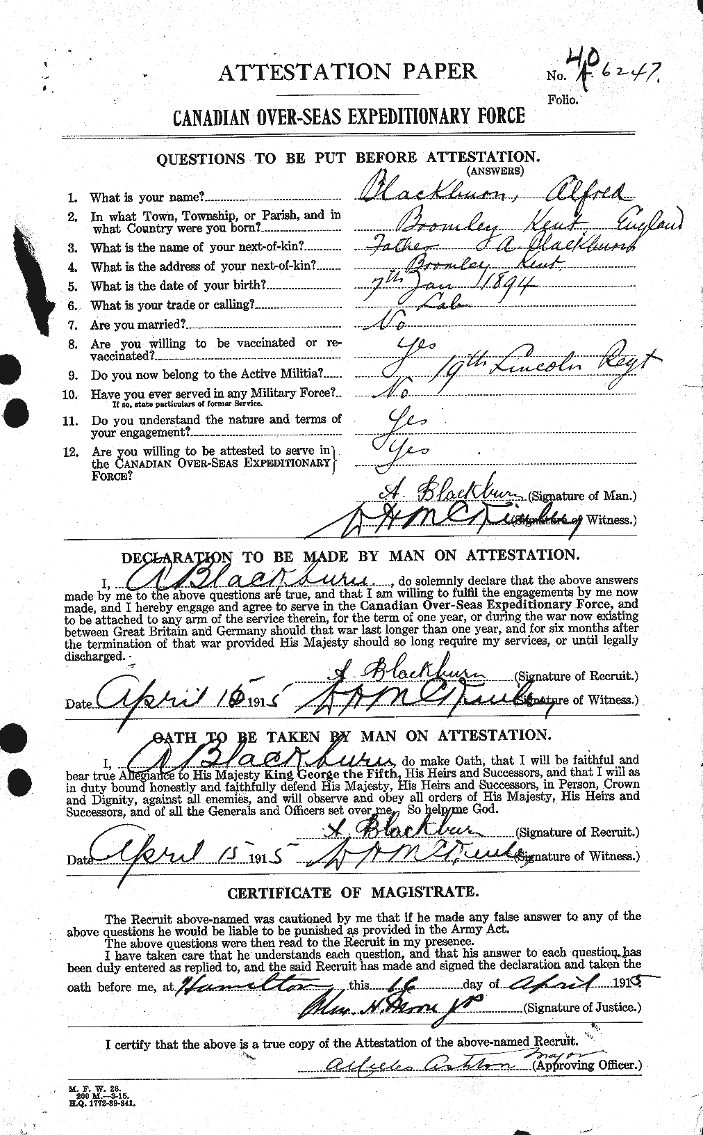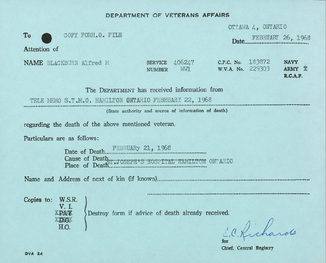 Family Search: When Sergeant Alfred Morley Blackburn was born on 7 January 1894, in Bromley, Kent, England, United Kingdom, his father, Alfred Morley Blackburn, was 26 and his mother, Edith Caroline Jackson, was 27. He had at least 6 sons and 3 daughters with Ada Ellen Ware. He immigrated to St. John, New Brunswick, Canada in 1912 and lived in Hamilton, Wentworth, Ontario, Canada in 1922 and Thornhill, York, Ontario, Canada in 1923. He registered for military service in 1915. In 1915, at the age of 21, his occupation is listed as labourer in Hamilton, Wentworth, Ontario, Canada. He died on 21 February 1968, in Hamilton, Ontario, Canada, at the age of 74, and was buried in Woodland Cemetery, Hamilton, Ontario, Canada.