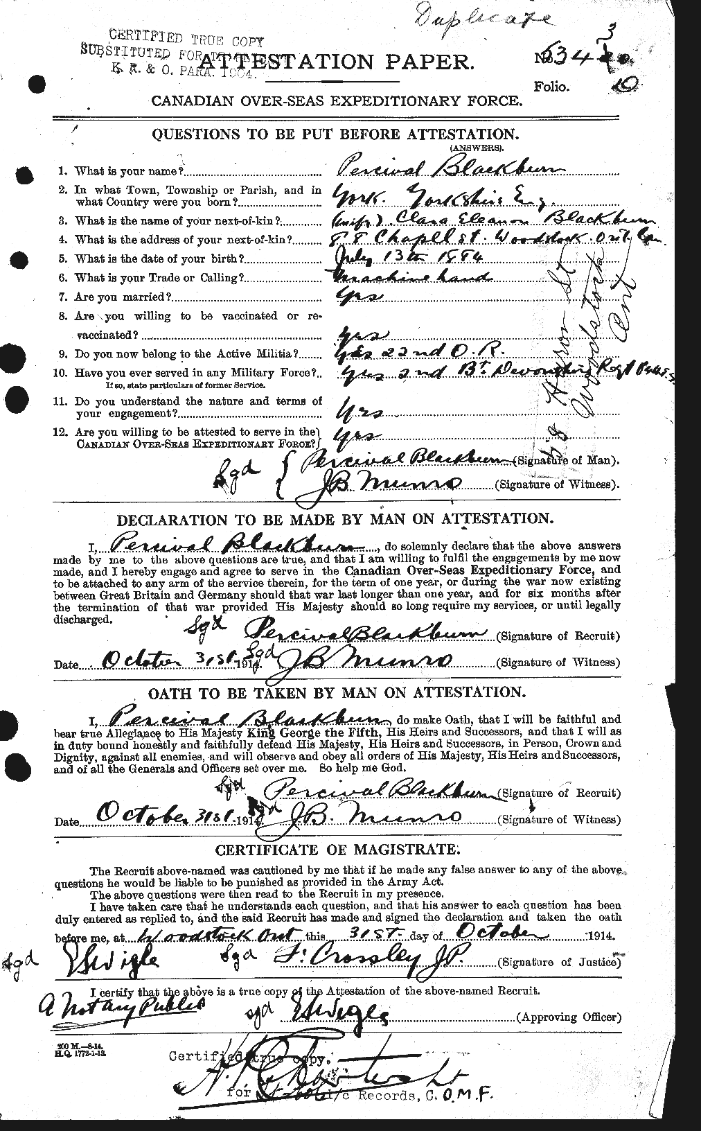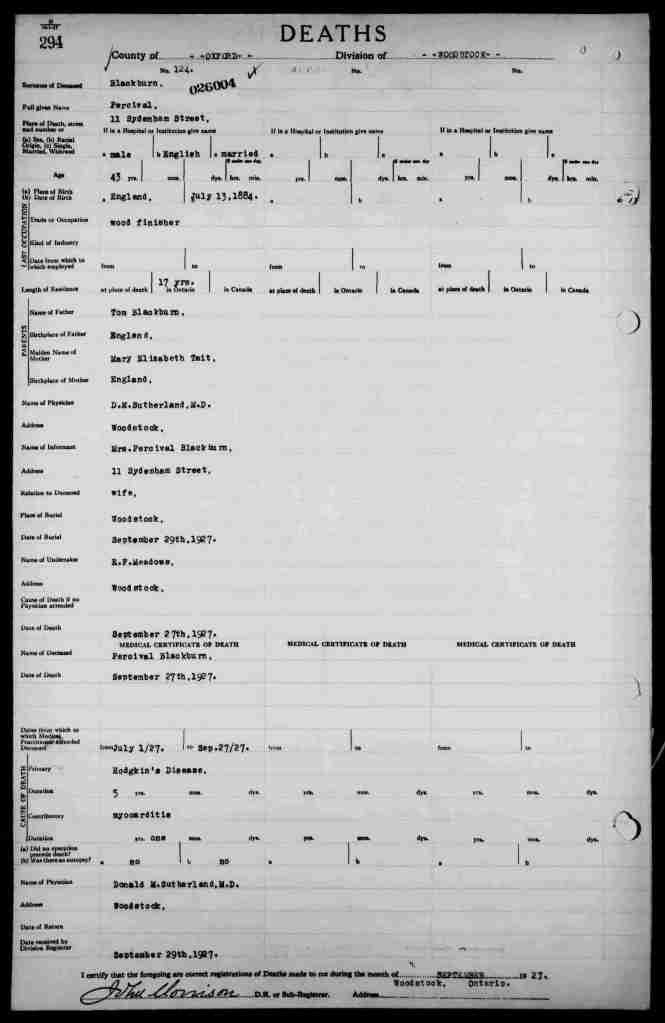 Family Search: When Private Percival Blackburn was born on 13 July 1884, in York, North Yorkshire, England, United Kingdom, his father, Thomas Blackburn, was 33 and his mother, Mary Elizabeth Tate, was 27. He married Clara Eleanor Ann Phillips on 8 August 1914, in Woodstock, Oxford, Ontario, Canada. They were the parents of at least 2 sons and 3 daughters. He lived in Battersea, London, England, United Kingdom for about 10 years. He died on 27 September 1927, in Woodstock, Oxford, Ontario, Canada, at the age of 43, and was buried in Anglican Cemetery, Woodstock, Oxford, Ontario, Canada.