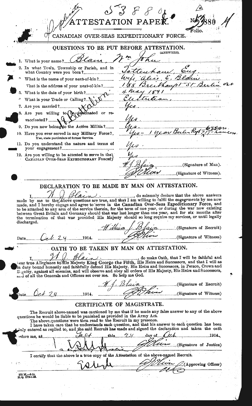 Blain, William John: Service no. 53880 Digitized Service Record CVWM Page (Died 1942) Source: Great War Project searching town of Tottenham, England. Find-A-Grave Blain, William John: Service no. 53880. Source: CVWM Blaine is on the right. With his wife Alice. E. Blain. Circa 1939-42. Share this: Click to email a link to a friend (Opens in new window) Email Click to share on Facebook (Opens in new window) Facebook Click to share on X (Opens in new window) X Click to share on Reddit (Opens in new window) Reddit Click to share on LinkedIn (Opens in new window) LinkedIn Click to print (Opens in new window) Print Click to share on Tumblr (Opens in new window) Tumblr Click to share on Pocket (Opens in new window) Pocket Click to share on Pinterest (Opens in new window) Pinterest Click to share on Telegram (Opens in new window) Telegram Click to share on WhatsApp (Opens in new window) WhatsApp Like Loading...
