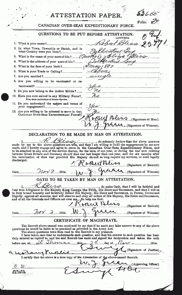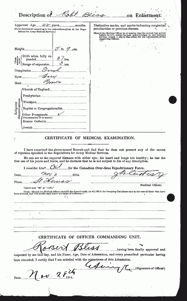 | January 18, 1919 | Discharged | According to this Discharge Certificate, Private Bliss was released from his service at London, Ontario (Military District 1) as medically unfit due to a GSW to his right arm. His last pay certificate shows his mother living at Church Terrace, Rolverden, Cranbrooke, Kent, England. |