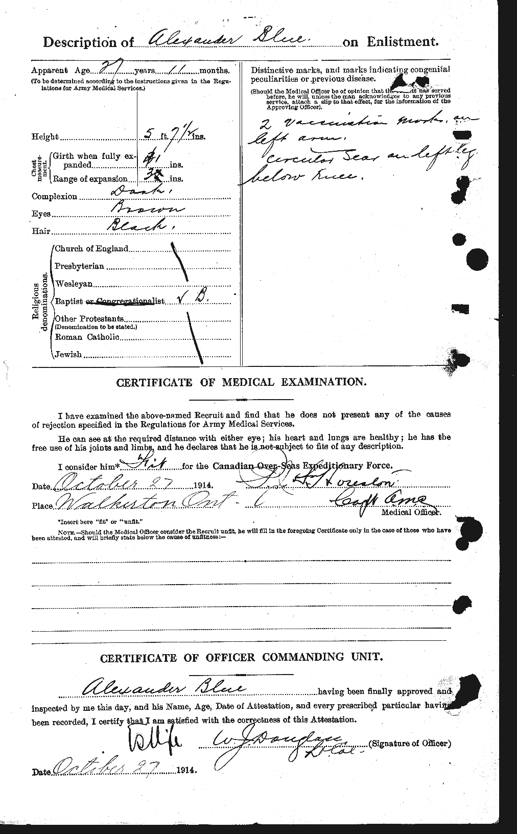 Family Search: When Private Alexander Edward Blue was born on 23 November 1886, in Paisley, Bruce, Ontario, Canada, his father, Alexander Hamilton Blue, was 31 and his mother, Elizabeth Reid, was 24. He married Alice Lilian Pratt in 1917, in Ashford, Middlesex, England, United Kingdom. They were the parents of at least 1 son and 3 daughters. He registered for military service in 1914. In 1914, at the age of 28, his occupation is listed as tinsmith. He died on 2 June 1958, in Walkerton, Bruce, Ontario, Canada, at the age of 71, and was buried in Starkvale Cemetery, Paisley, Bruce, Ontario, Canada.