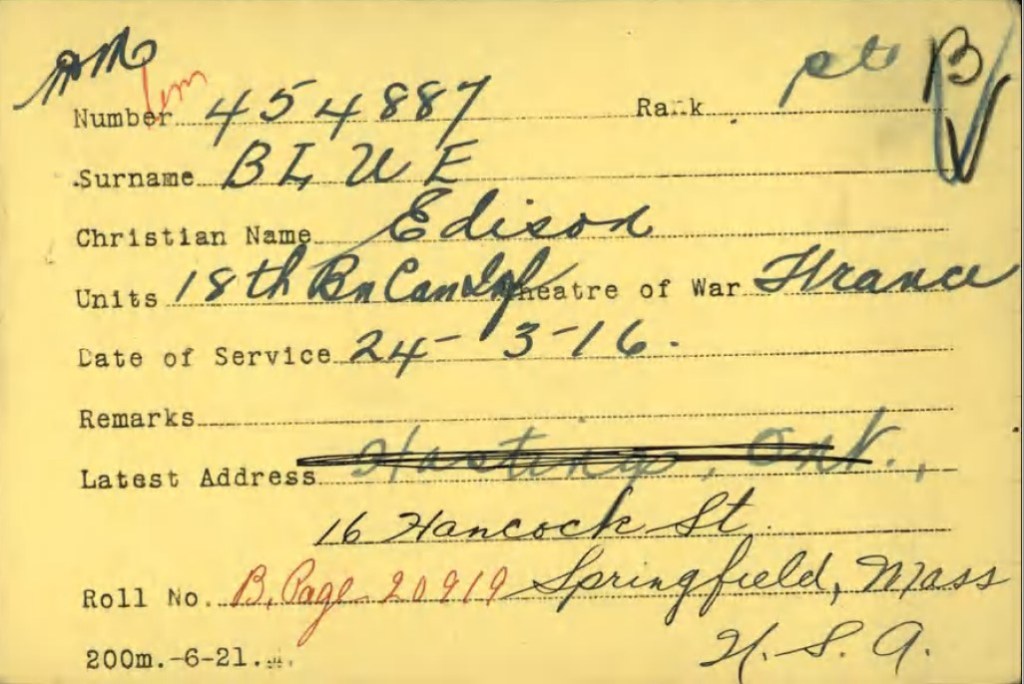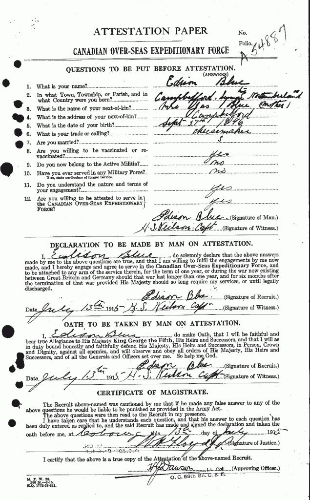 He served with the CEF (Canadian Over-Seas Expeditionary Force), 18th Battalion, during World War I. In his Attestation Paper, he stated that he was born at Campbellford, Northumberland County, Ontario, Canada, on September 27, 1896. Other documents give differing years of birth, and they also consistently indicate that he was born in Missouri, not Canada.” Source: Find-A-Grave.
