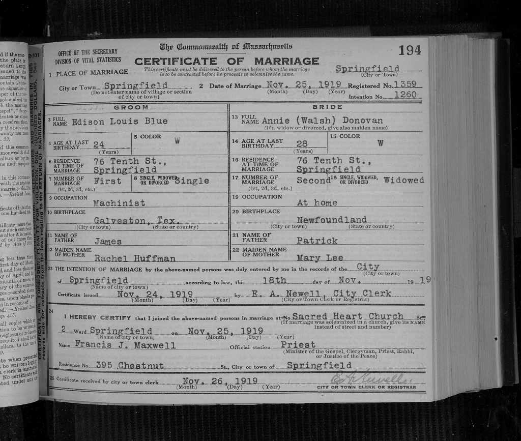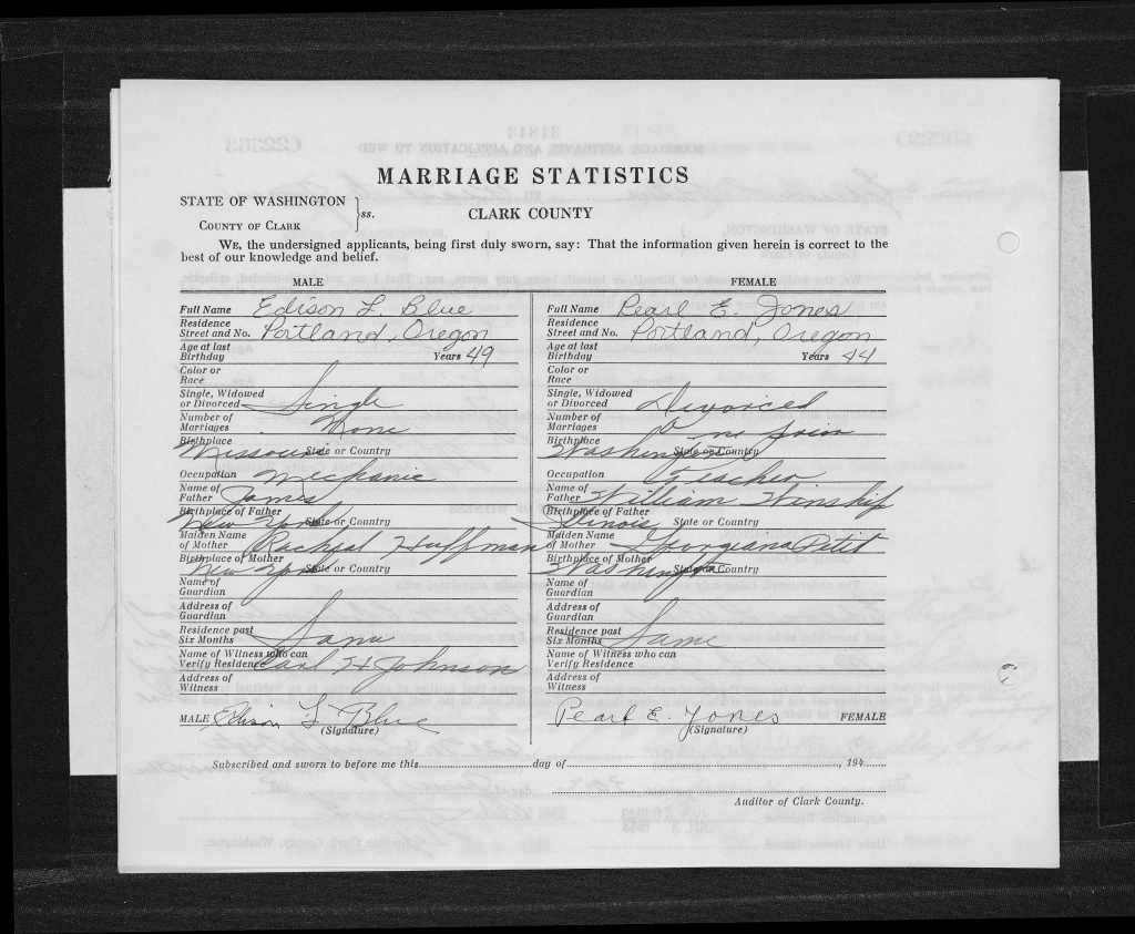 “He was the son of James Alexander Blue and Rachel Matilda Huffman. He married Pearl Ernestine Winship at Vancouver, Washington, on July 3, 1943.
