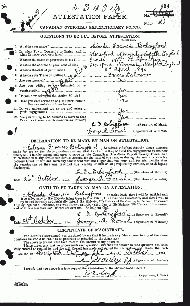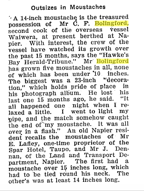 Bolingford, Claude Francis: Service no. 53434 Digitized Service Record Source: 18th Battalion Nominal Roll, April 1915. Find-A-Grave Outsizes in Moustaches re. CF Bolingford 53434 LOCAL AND GENERAL. ASHBURTON GUARDIAN, VOLUME 67, ISSUE 92, 29 JANUARY 1947, PAGE 4. Cemetery: Taruheru Block: RSA34 Plot #: 376 Share this: Click to email a link to a friend (Opens in new window) Email Click to share on Facebook (Opens in new window) Facebook Click to share on X (Opens in new window) X Click to share on Reddit (Opens in new window) Reddit Click to share on LinkedIn (Opens in new window) LinkedIn Click to print (Opens in new window) Print Click to share on Tumblr (Opens in new window) Tumblr Click to share on Pocket (Opens in new window) Pocket Click to share on Pinterest (Opens in new window) Pinterest Click to share on Telegram (Opens in new window) Telegram Click to share on WhatsApp (Opens in new window) WhatsApp Like Loading...