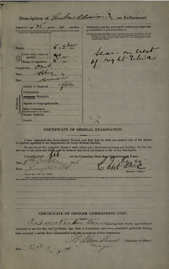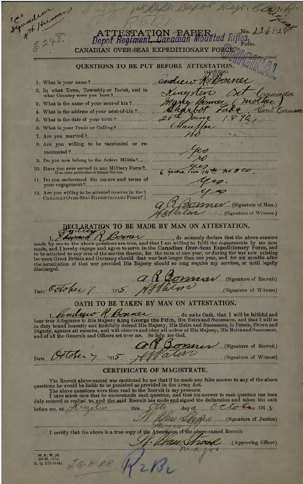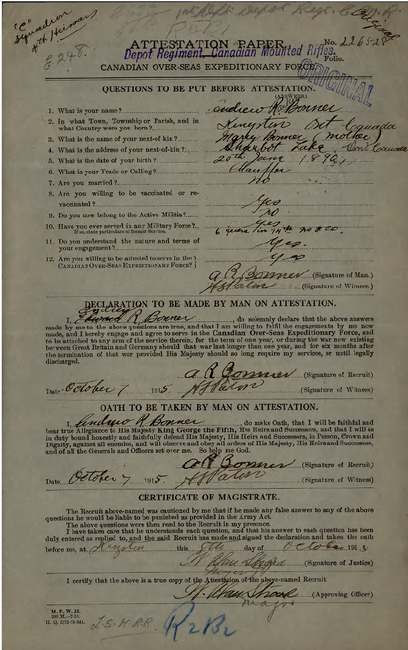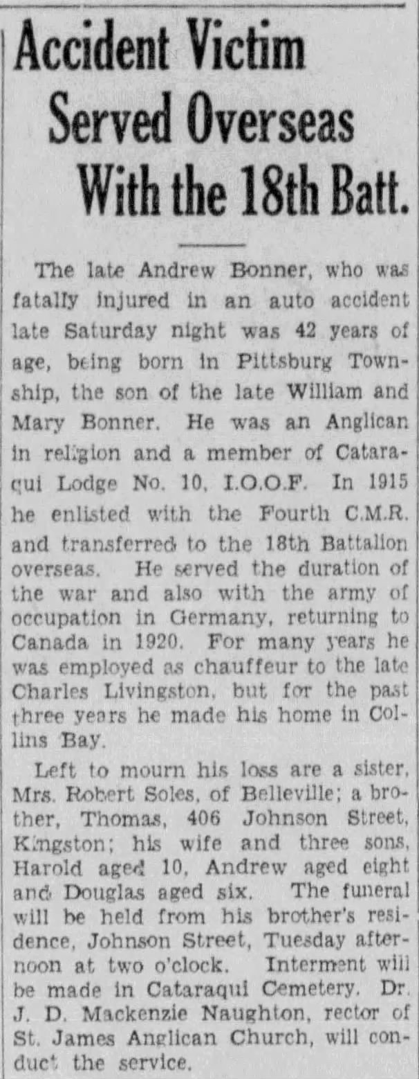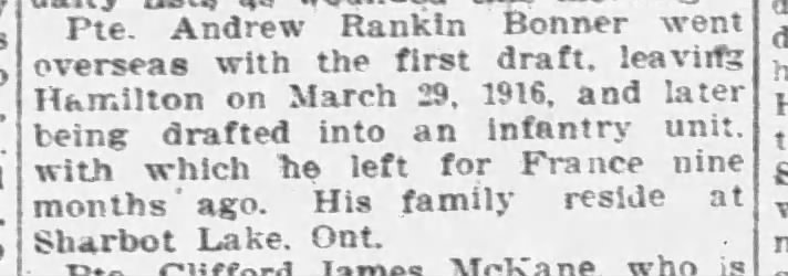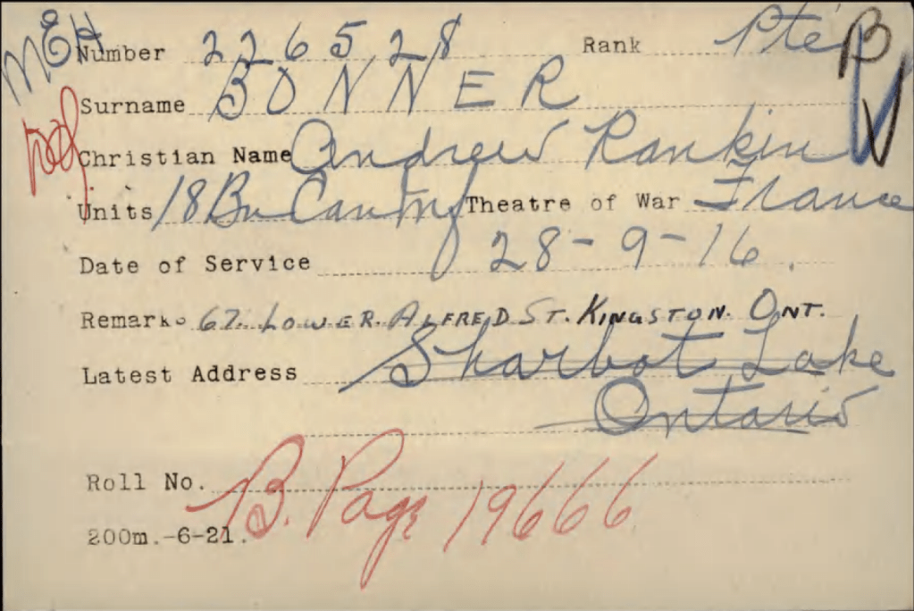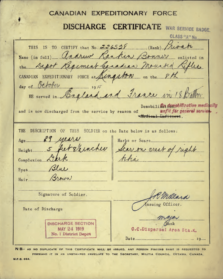 Bonner, Andrew Rankin: Service no. 226528 Digitized Service Record Source: SS Caronia Passenger Manifest. 1919. Find-A-Grave Family Search: Share this: Click to email a link to a friend (Opens in new window) Email Click to share on Facebook (Opens in new window) Facebook Click to share on X (Opens in new window) X Click to share on Reddit (Opens in new window) Reddit Click to share on LinkedIn (Opens in new window) LinkedIn Click to print (Opens in new window) Print Click to share on Tumblr (Opens in new window) Tumblr Click to share on Pocket (Opens in new window) Pocket Click to share on Pinterest (Opens in new window) Pinterest Click to share on Telegram (Opens in new window) Telegram Click to share on WhatsApp (Opens in new window) WhatsApp Like Loading...