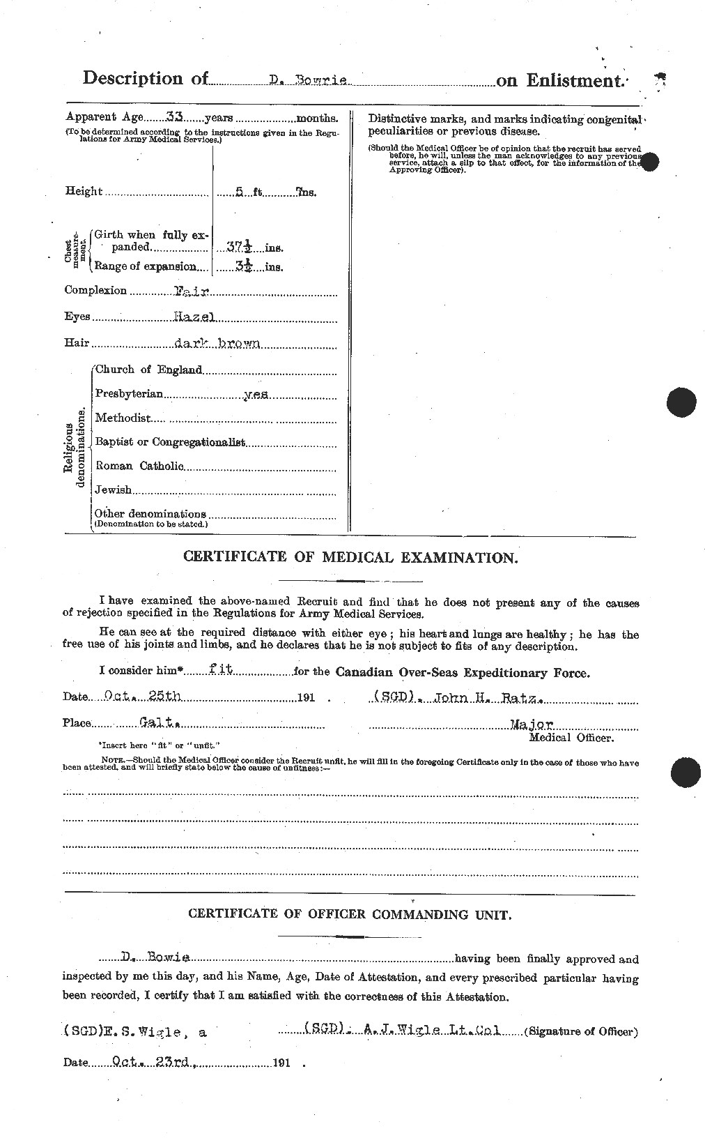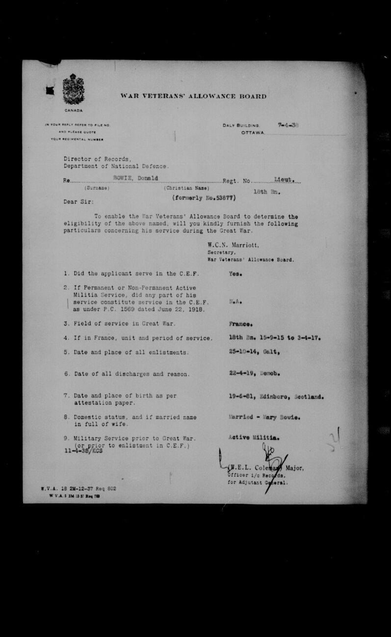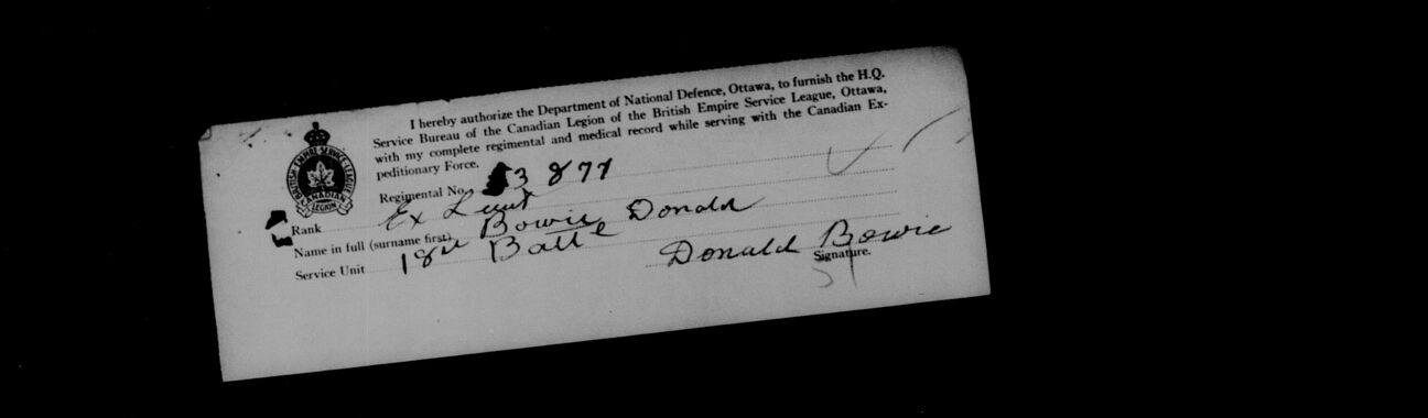 Bowie, Donald: Lieutenant Digitized Service Record Find-A-Grave Note that this soldier was assigned the regimental number 53877. Lieutenant David Bowie, Mount View Cemetery, Cambridge, Ontario, Canada. Documents via Allan Miller, 18th Battalion Facebook Group. Share this: Click to email a link to a friend (Opens in new window) Email Click to share on Facebook (Opens in new window) Facebook Click to share on X (Opens in new window) X Click to share on Reddit (Opens in new window) Reddit Click to share on LinkedIn (Opens in new window) LinkedIn Click to print (Opens in new window) Print Click to share on Tumblr (Opens in new window) Tumblr Click to share on Pocket (Opens in new window) Pocket Click to share on Pinterest (Opens in new window) Pinterest Click to share on Telegram (Opens in new window) Telegram Click to share on WhatsApp (Opens in new window) WhatsApp Like Loading... Leave a comment Cancel reply Δ This site uses Akismet to reduce spam. Learn how your comment data is processed.