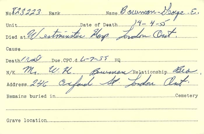 Family Search: When George Edward Bowman was born on 30 July 1889, in London Township, Middlesex, Ontario, Canada, his father, George Sargent Bowman, was 29 and his mother, Mary Anne Poole, was 28. He lived in Middlesex, Ontario, Canada in 1901. He registered for military service in 1915. In 1915, at the age of 26, his occupation is listed as carriage and sign writer in London, Ontario, Canada. He died on 14 April 1955, in London, Ontario, Canada, at the age of 65, and was buried in Woodland Cemetery, London, Ontario, Canada.