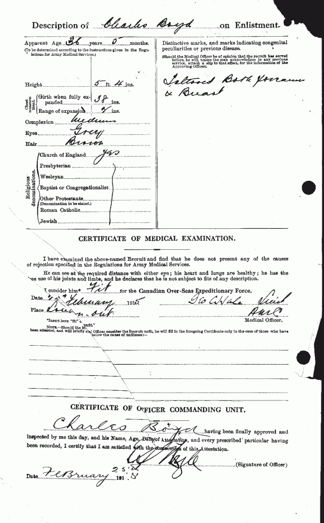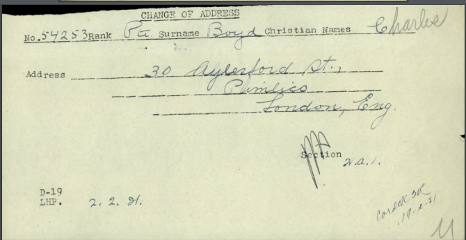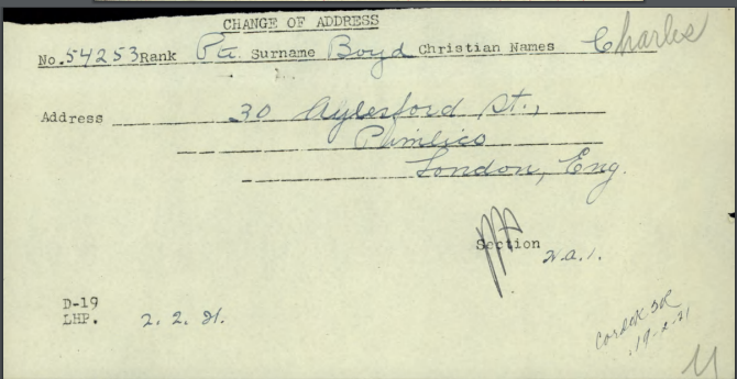 Family Search: Private Charles Boyd was born on 24 September 1877, in London, England, United Kingdom. He married Ellen Weaver in 1915, in Chelsea, London, England, United Kingdom. They were the parents of at least 1 son and 2 daughters. He died in England, United Kingdom.