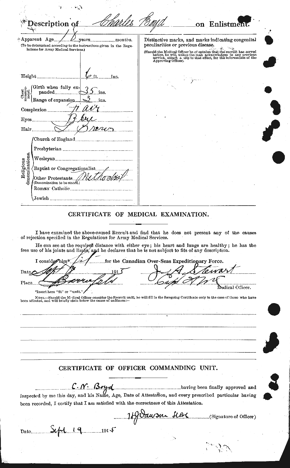 | September 4, 1915 | Enlisted | Enlisted in “Barriefield” (CFB Kingston) under reg. no. 455590. Indicates having 3 years experience as a Cadet in high school. He has attested to the 59th Battalion. |