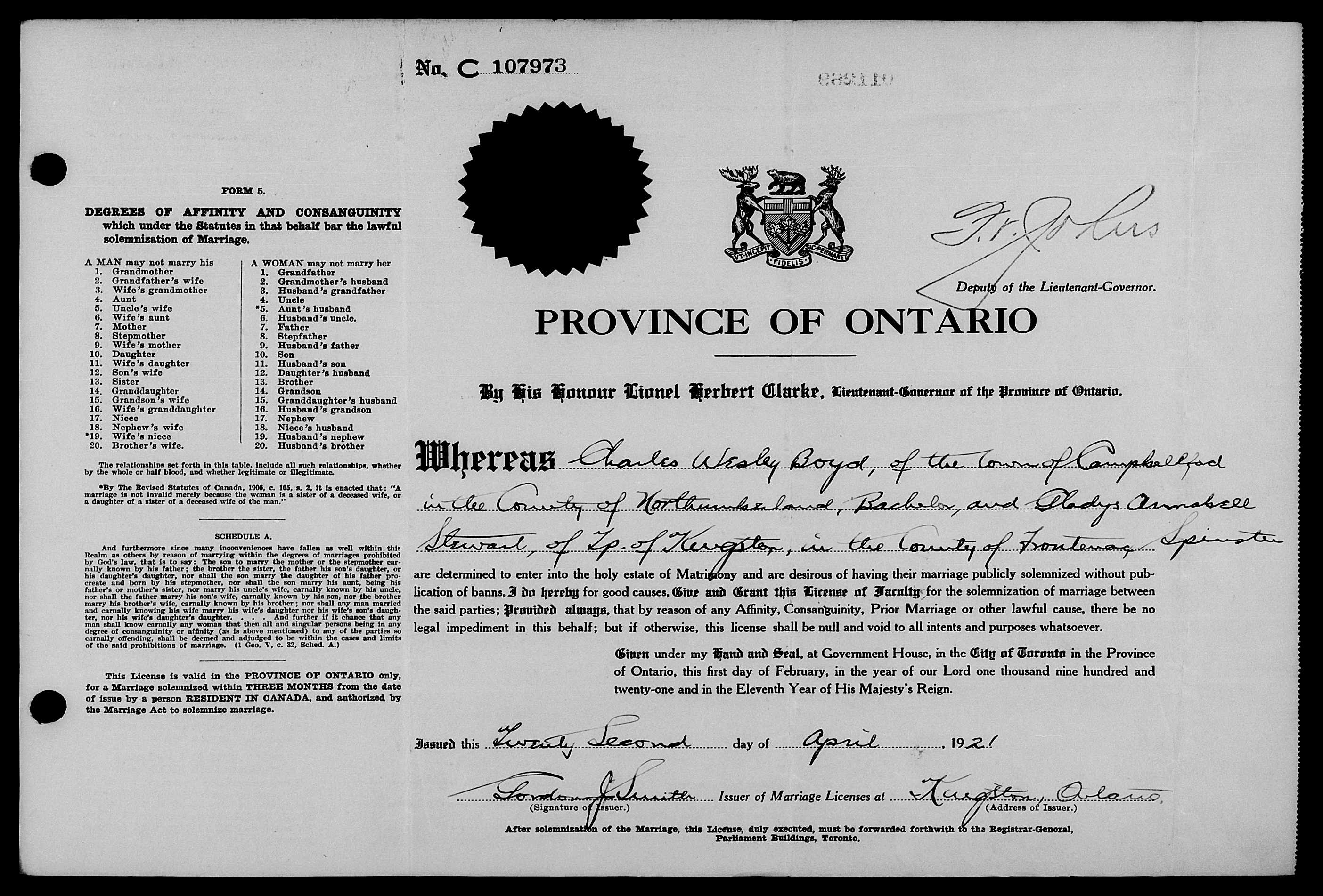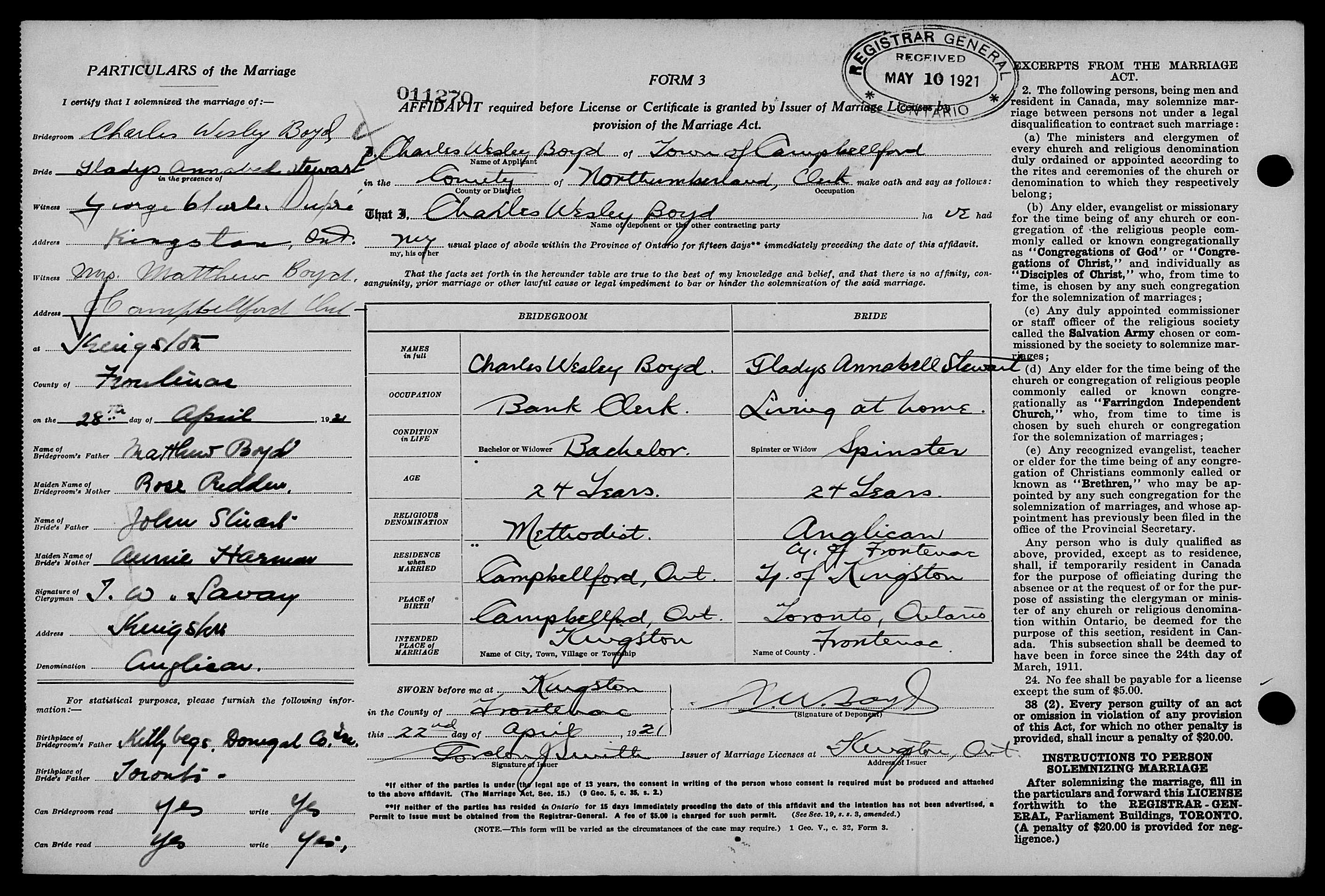 Family Search: When Charles Wesley Boyd was born on 11 October 1896, in Trent Hills, Northumberland, Ontario, Canada, his father, Mathew Boyd, was 39 and his mother, Rose Ann Redden, was 26. He married Gladys Anne Stewart on 28 April 1920, in Kingston, Frontenac, Ontario, Canada. They were the parents of at least 1 daughter. He lived in Northumberland, Ontario, Canada for about 10 years. He died on 20 January 1973, at the age of 76, and was buried in Greenwood Cemetery, Burlington, Halton, Ontario, Canada.
