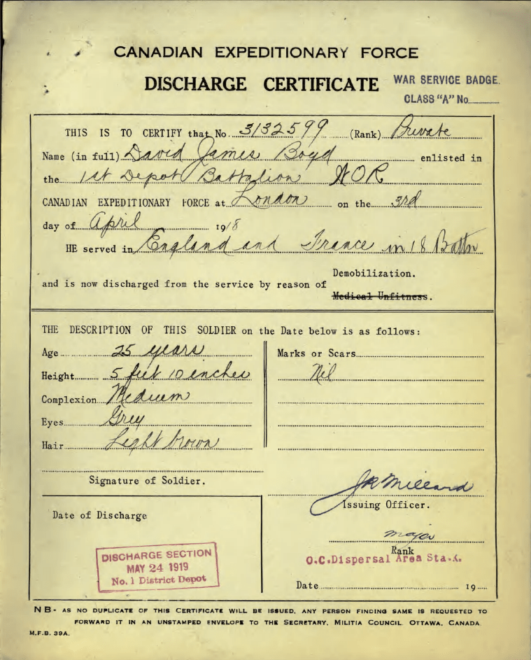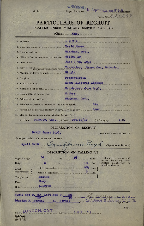 Family Search: When Private David James Boyd was born on 7 June 1893, in Culross Township, Bruce, Ontario, Canada, his father, John James Boyd, was 34 and his mother, Dorcas Jane Colvin, was 37. He lived in Wingham, Huron, Ontario, Canada in 1918 and Durban, Swan Valley West, Manitoba, Canada in 1923. He registered for military service in 1918. In 1918, at the age of 25, his occupation is listed as hyrdo electric lineman in Wingham, Huron, Ontario, Canada. He died on 16 April 1960, in South Porcupine, Timmins, Cochrane, Ontario, Canada, at the age of 66, and was buried in Ontario, Canada.