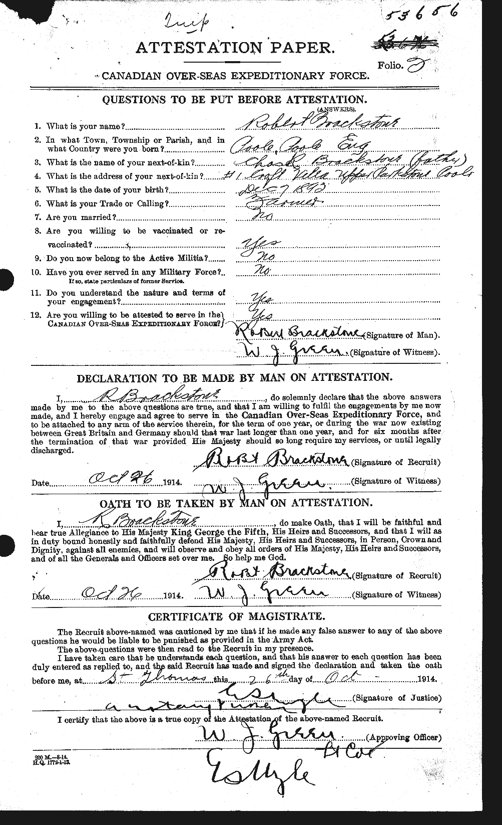 “Robert’s name appears in a letter printed in the Aylmer Express, November 26, 1914 from “the Aylmer Boys” while in London awaiting their journey overseas. His name is not included in any previous lists of recruits, nor is his place of residence given on his attestation paper. It is assumed he was living in the Aylmer area when he enlisted for service on October 26, 1914 in St. Thomas. He was born on December 7, 1893 in Poole, Dorset, England. He names his next of kin as his father, Charles R. Brackstone, of #1 Croft Villa, Upper Post Stone [?], Poole, England. He was a farmer and was not married.