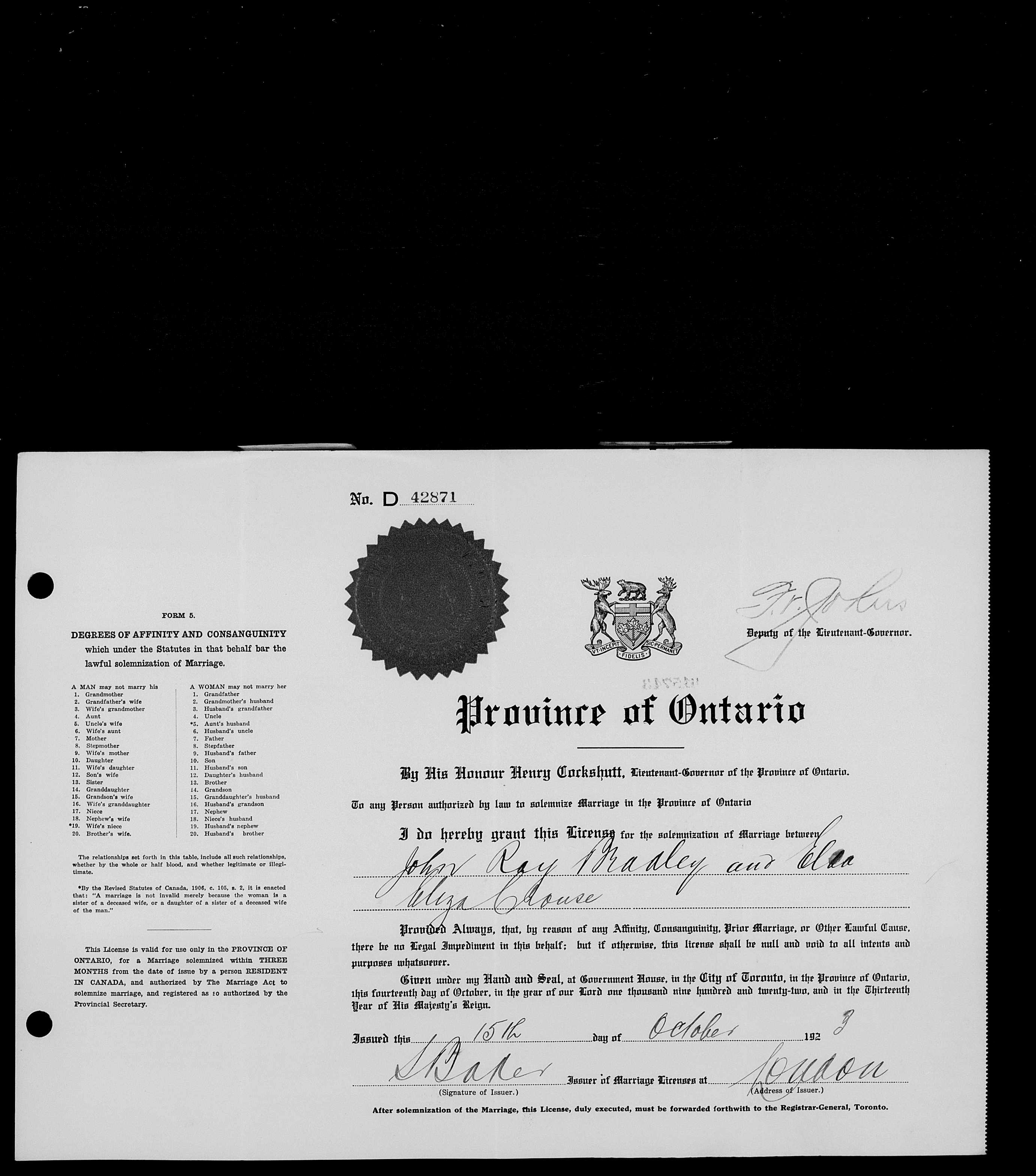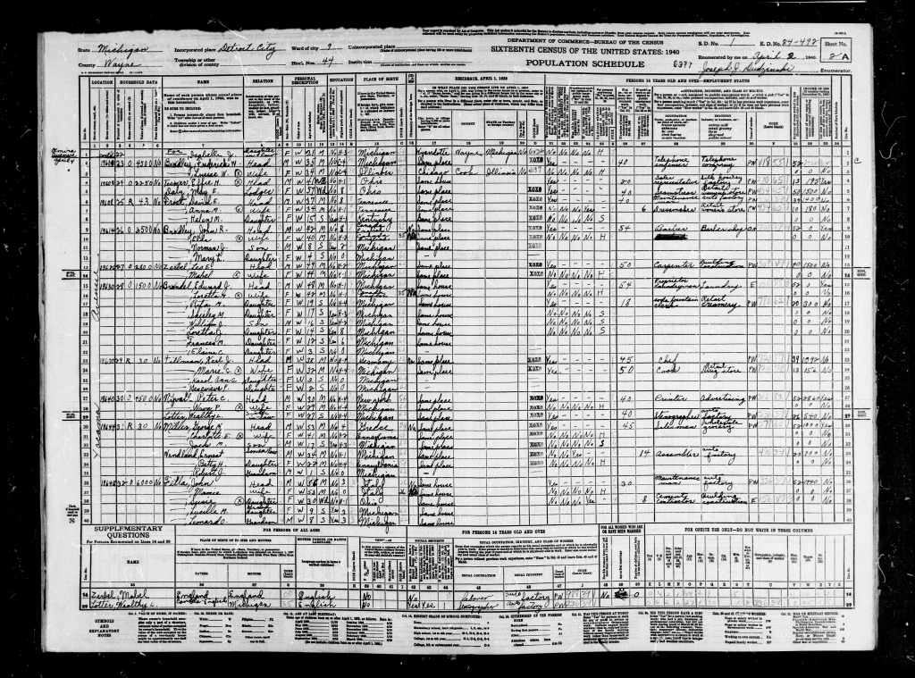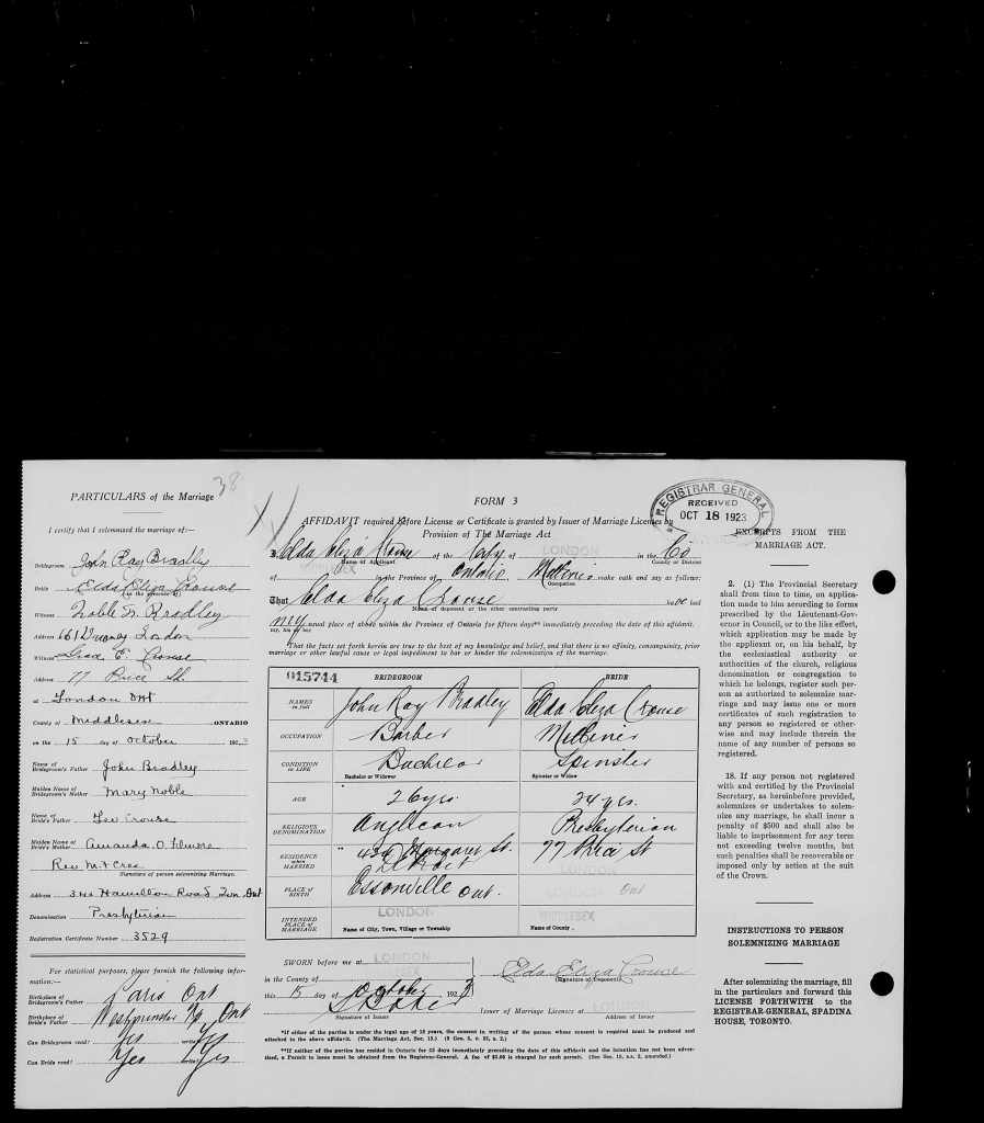 Family Search: When John Ray Bradley was born on 14 July 1897, in Essonville, Highlands East, Haliburton, Dysart et al, Haliburton, Ontario, Canada, his father, John Bradley, was 35 and his mother, Mary Noble, was 27. He married Elda Eliza Crouse on 15 October 1923, in London, Ontario, Canada West, British Colonial America. They were the parents of at least 1 son and 1 daughter. He lived in Peterborough, Ontario, Canada in 1901 and London, Ontario, Canada in 1916. He registered for military service in 1916. In 1916, at the age of 19, his occupation is listed as machinist – london free press in London, Ontario, Canada. He died on 8 July 1952, in Detroit, Wayne, Michigan, United States, at the age of 54.