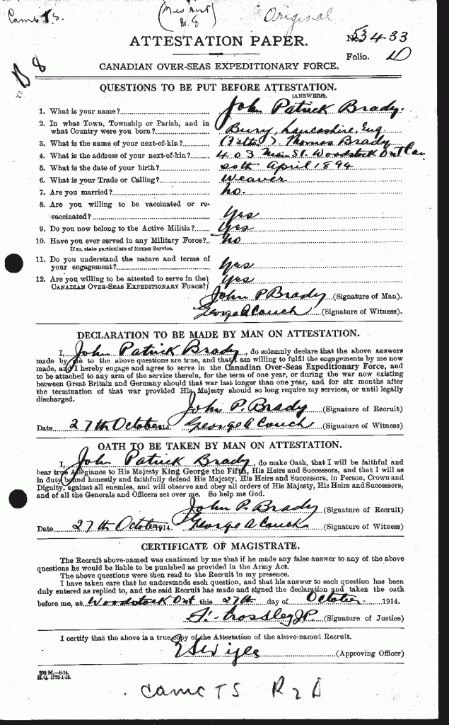 Brady, John Patrick: Service no. 53433 Digitized Service Record Source: 18th Battalion Nominal Roll, April 1915. Find-A-Grave Drummer. Share this: Click to email a link to a friend (Opens in new window) Email Click to share on Facebook (Opens in new window) Facebook Click to share on X (Opens in new window) X Click to share on Reddit (Opens in new window) Reddit Click to share on LinkedIn (Opens in new window) LinkedIn Click to print (Opens in new window) Print Click to share on Tumblr (Opens in new window) Tumblr Click to share on Pocket (Opens in new window) Pocket Click to share on Pinterest (Opens in new window) Pinterest Click to share on Telegram (Opens in new window) Telegram Click to share on WhatsApp (Opens in new window) WhatsApp Like Loading...