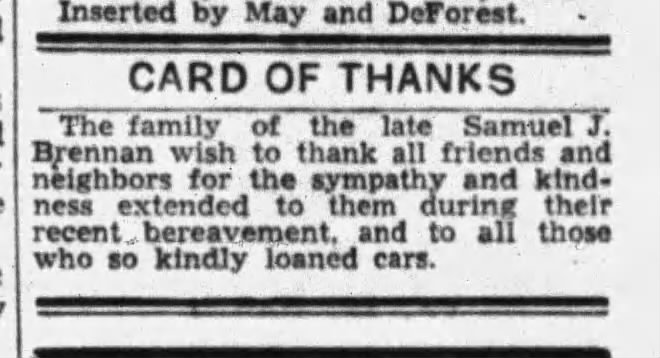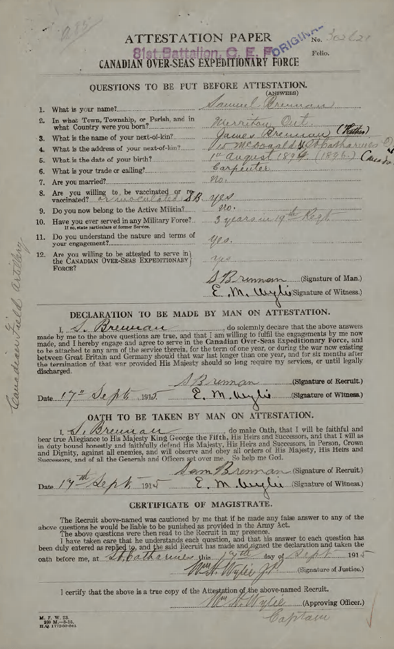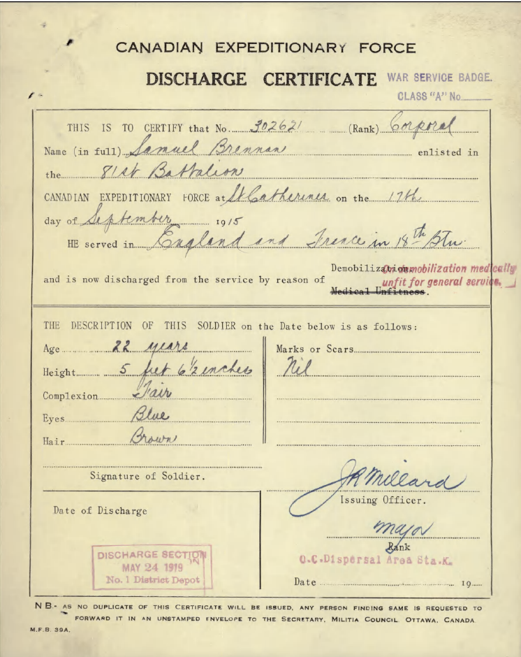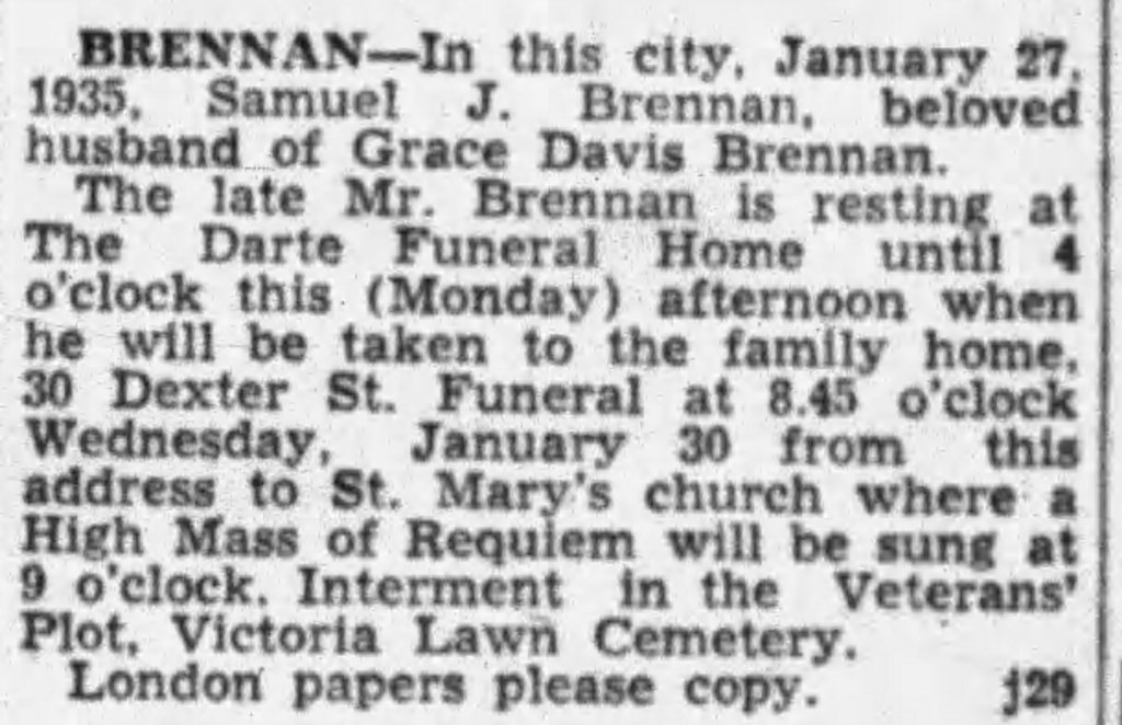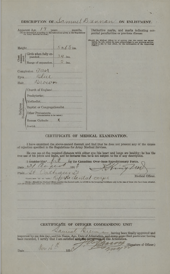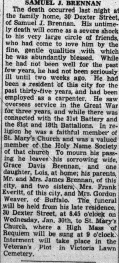 Family Search: Corporal Samuel John Brennan was born on 1 August 1898, in St. Catharines, Lincoln, Ontario, Canada as the son of James Brennan and Maggie Read. He married Grace Davis Brennan on 2 July 1920, in St. Catharines, Lincoln, Ontario, Canada. He lived in Lincolnshire, England, United Kingdom in 1901. He registered for military service in 1915. In 1915, at the age of 17, his occupation is listed as carpenter. He died on 27 January 1935, in Grantham, Lincoln, Ontario, Canada, at the age of 36, and was buried in Victoria Lawn Cemetery, St. Catharines, Niagara, Ontario, Canada.