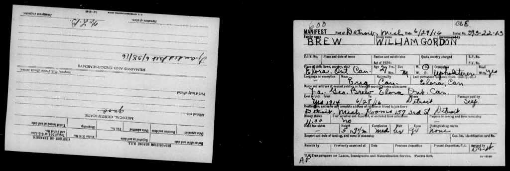 Family Search: When Private William Gordon Brew was born on 2 April 1889, in Elora, Wellington, Ontario, Canada, his father, George Edward Brew Sr., was 35 and his mother, Janet Jeffery, was 31. He married Anna Statia Healey on 9 October 1920, in Elora, Wellington, Ontario, Canada. He lived in Wellington, Ontario, Canada in 1911. He registered for military service in 1918. In 1918, at the age of 29, his occupation is listed as upholsterer in Elora, Wellington, Ontario, Canada. He died on 9 September 1921, in Elora, Wellington, Ontario, Canada, at the age of 32, and was buried in Elora Cemetery, Elora, Wellington, Ontario, Canada.