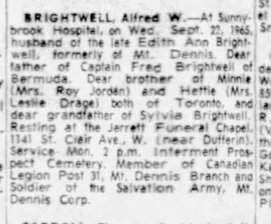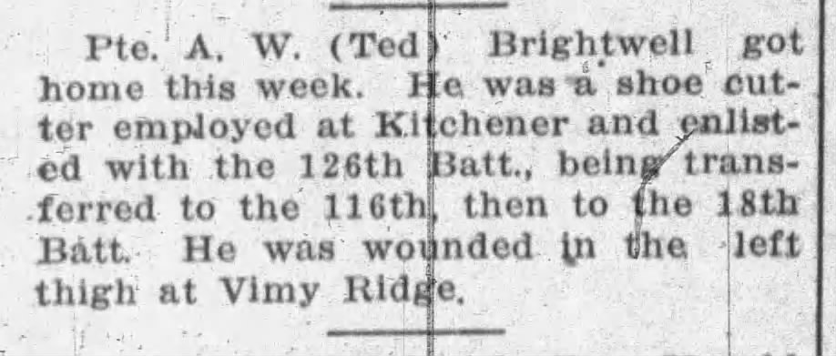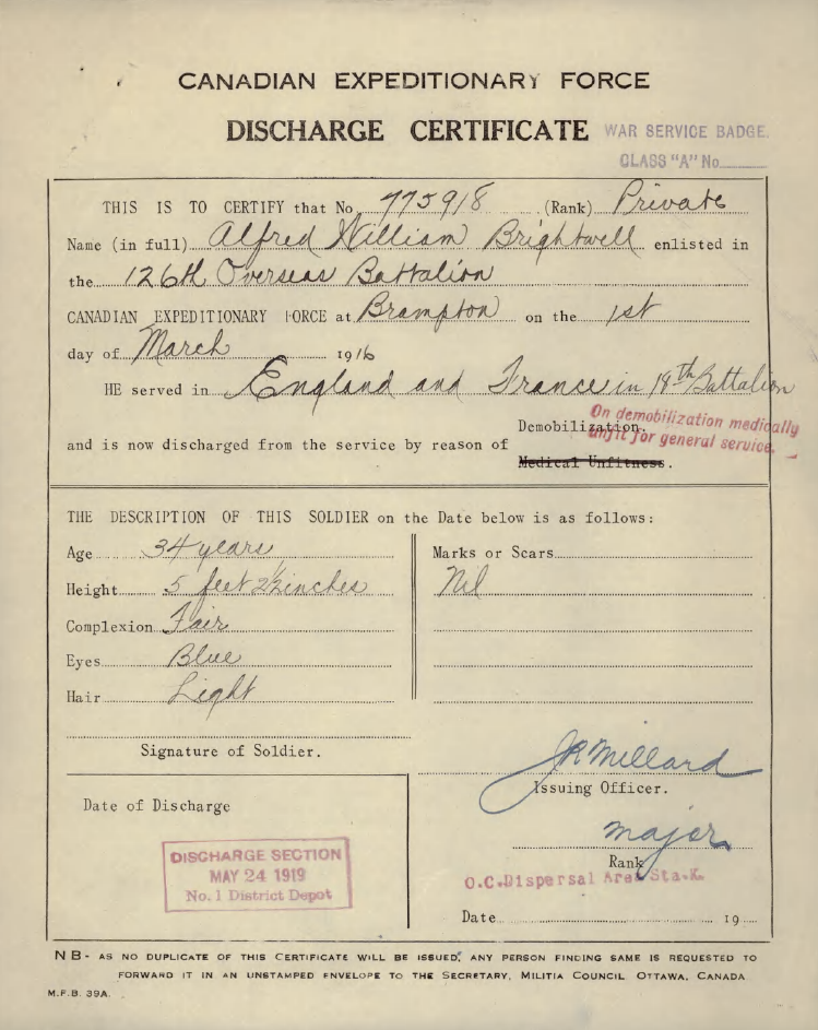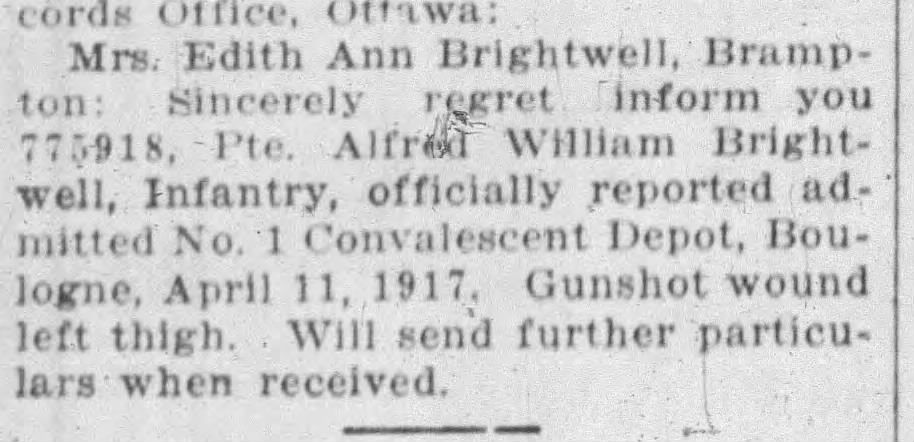 Family Search:When Private Alfred William Brightwell was born on 11 February 1885, in Norwich, Norfolk, England, United Kingdom, his father, Edward Brightwell, was 20 and his mother, Eliza Rebecca Ringer, was 20. He married Edith Ann LATEY on 25 September 1912. They were the parents of at least 1 son. He lived in Brampton, Peel, Ontario, Canada in 1916 and Toronto, York, Ontario, Canada in 1931. He registered for military service in 1916. In 1916, at the age of 31, his occupation is listed as shoe cutter in Brampton, Peel, Ontario, Canada. He died in 1965, at the age of 80, and was buried in Prospect Cemetery, Toronto, Ontario, Canada.Ontario, Canada. He died in Canada.