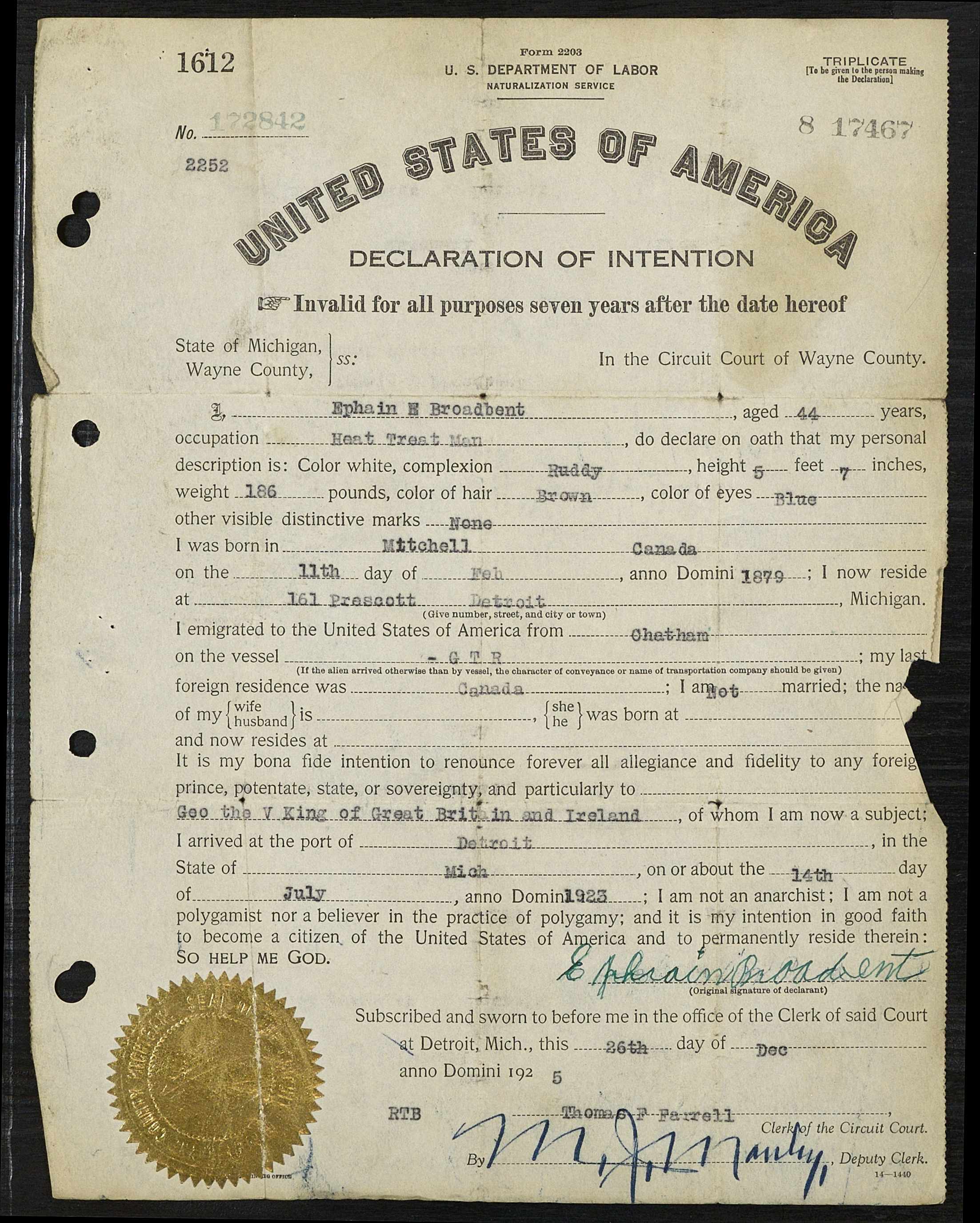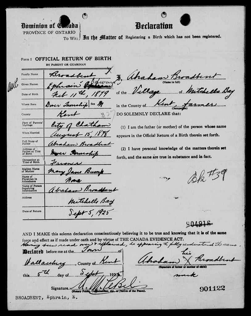 Family Source: When Private Ephraim Edward Broadbent was born on 11 February 1879, in Dover, Kent, Ontario, Canada, his father, Abraham Broadbent, was 31 and his mother, Mary Jane Bump, was 25. He married Emma Louise Johnson in December 1902. He immigrated to Detroit, Wayne, Michigan, United States in 1925 and lived in Mitchell’s Bay, Kent, Ontario, Canada in 1916 and Detroit, Wayne, Michigan, United States for about 3 years. He registered for military service in 1916. In 1925, at the age of 46, his occupation is listed as heat treat man in Detroit, Wayne, Michigan, United States. He died on 12 August 1955, at the age of 76, and was buried in London Township, Middlesex, Ontario, Canada.