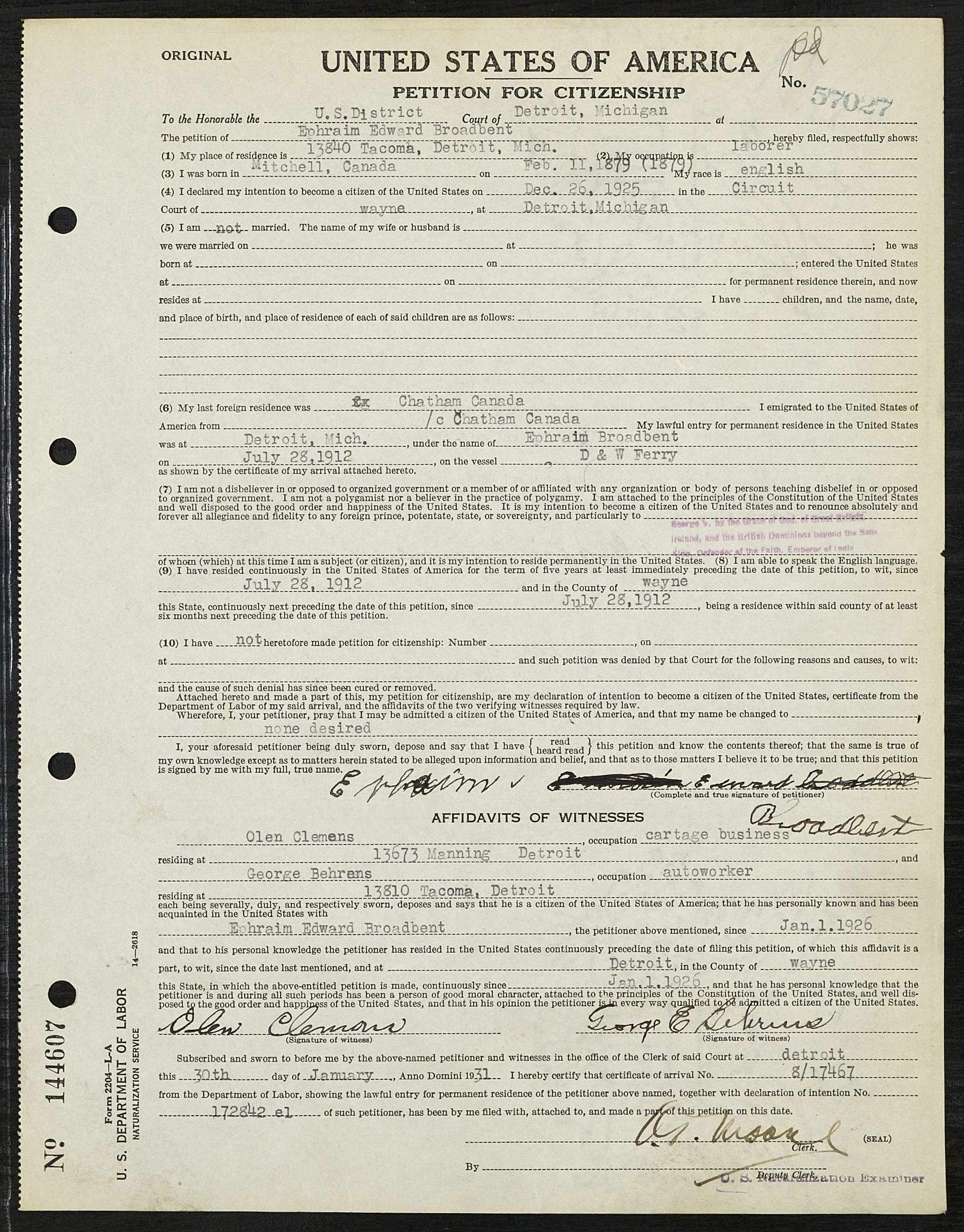Family Source: When Private Ephraim Edward Broadbent was born on 11 February 1879, in Dover, Kent, Ontario, Canada, his father, Abraham Broadbent, was 31 and his mother, Mary Jane Bump, was 25. He married Emma Louise Johnson in December 1902. He immigrated to Detroit, Wayne, Michigan, United States in 1925 and lived in Mitchell’s Bay, Kent, Ontario, Canada in 1916 and Detroit, Wayne, Michigan, United States for about 3 years. He registered for military service in 1916. In 1925, at the age of 46, his occupation is listed as heat treat man in Detroit, Wayne, Michigan, United States. He died on 12 August 1955, at the age of 76, and was buried in London Township, Middlesex, Ontario, Canada.